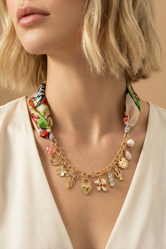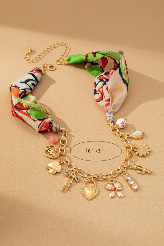A playful statement necklace featuring a vibrant printed scarf cord paired with a polished gold-tone charm chain. Delicate mixed charms including florals, hearts, pearls, and sparkling accents create a whimsical yet elevated look. The adjustable length allows for comfortable layering while adding eye-catching texture and movement around the neckline.