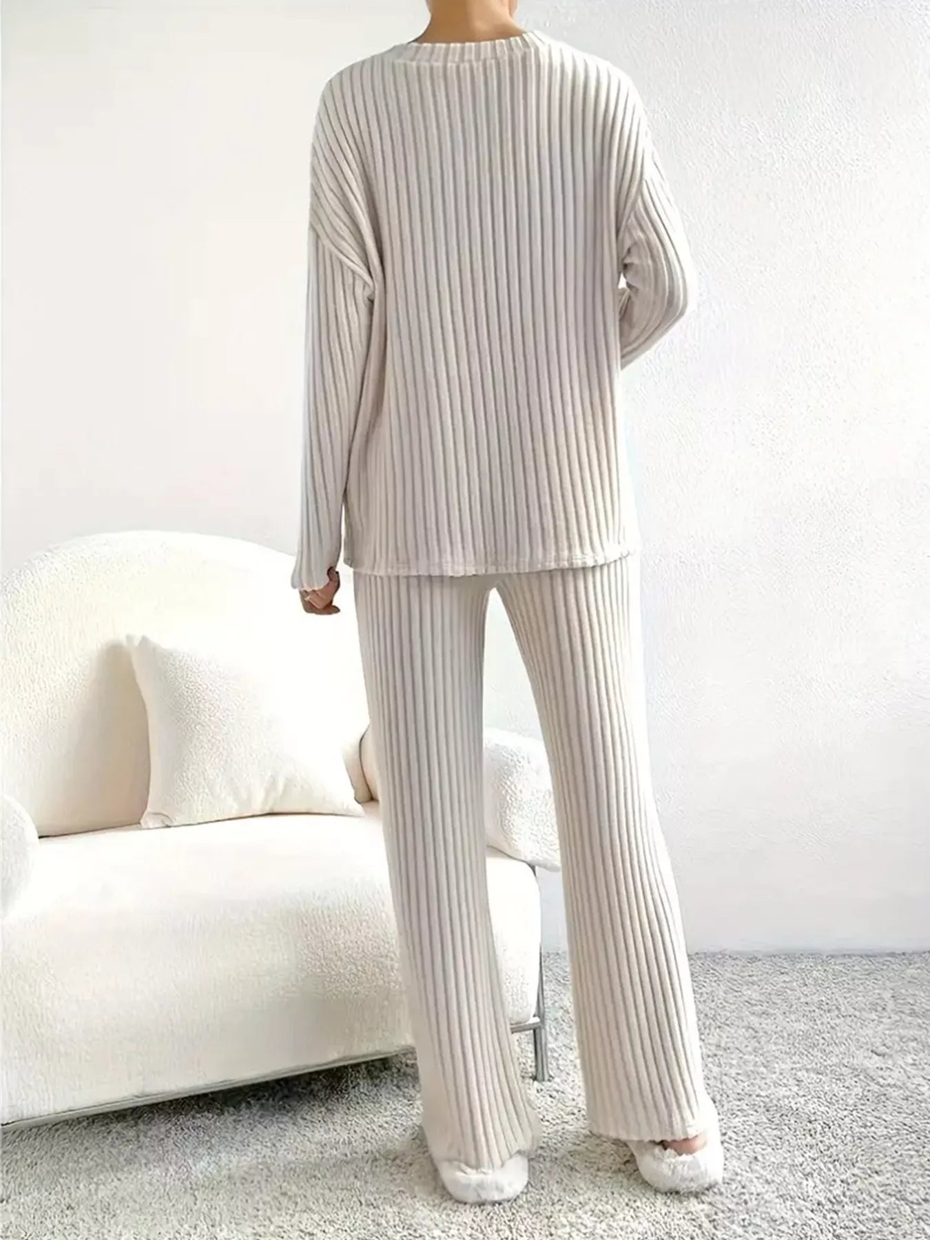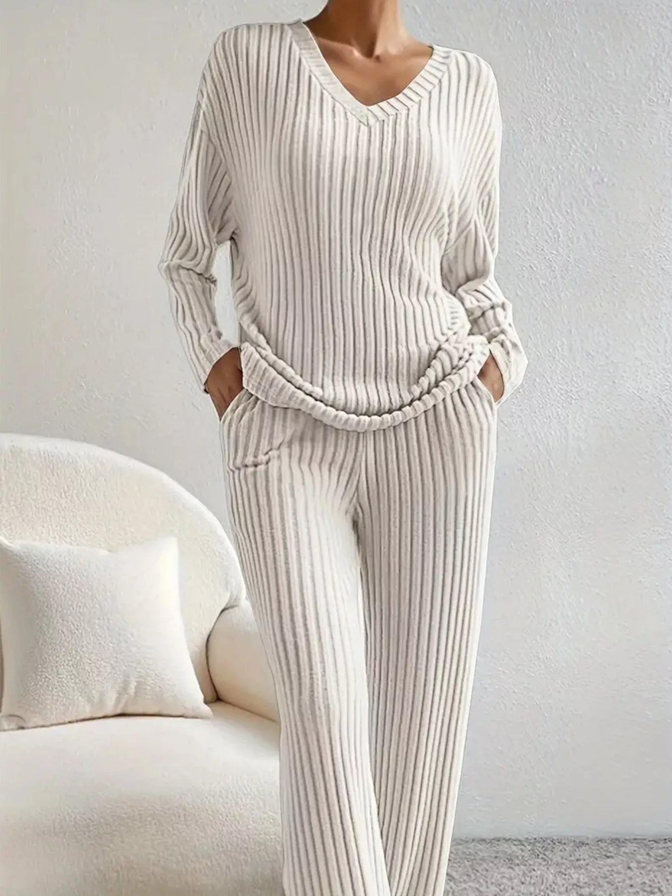Ribbed Knit V-Neck Top and Pants Set