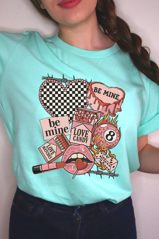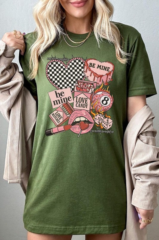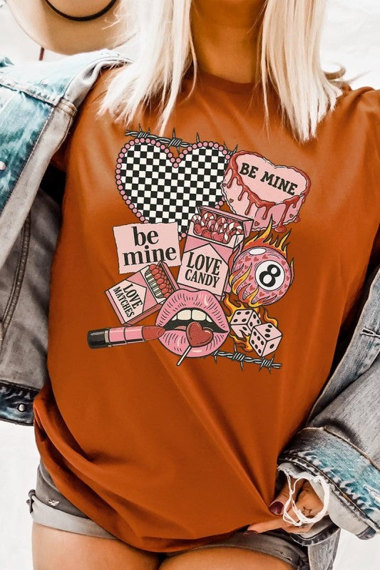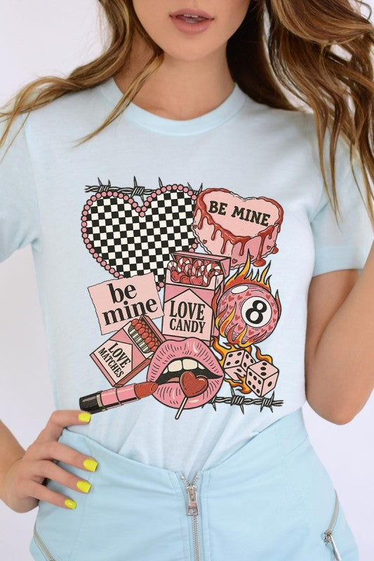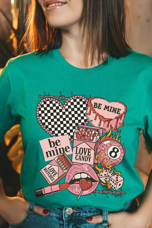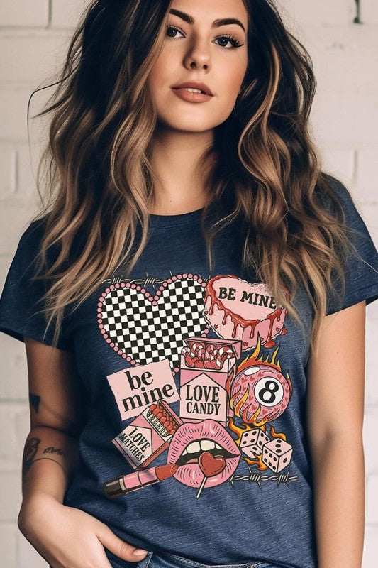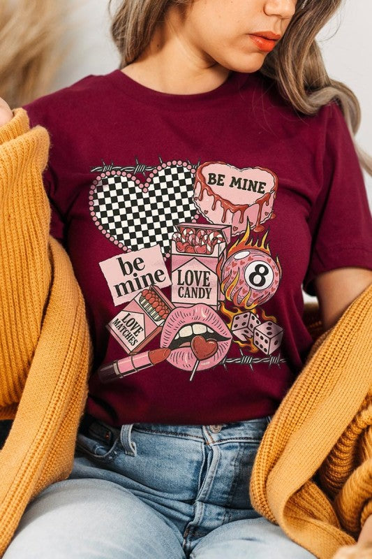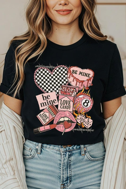 valentine graphic tee, candy collage shirt, retro love icons top, western style valentine tee, western inspired graphic shirt, cowboy western aesthetic, heart themed apparel, boutique seasonal wear, cute romantic graphic, holiday casual style Graphic Tee.