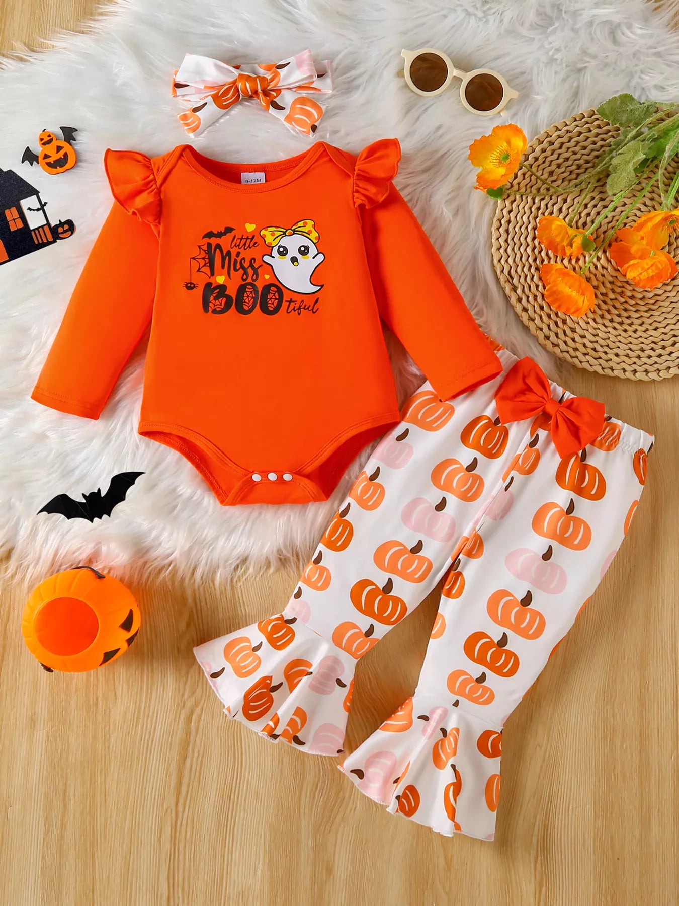 Children's Halloween Graphic Top and Pants 3-Piece Set with Headband