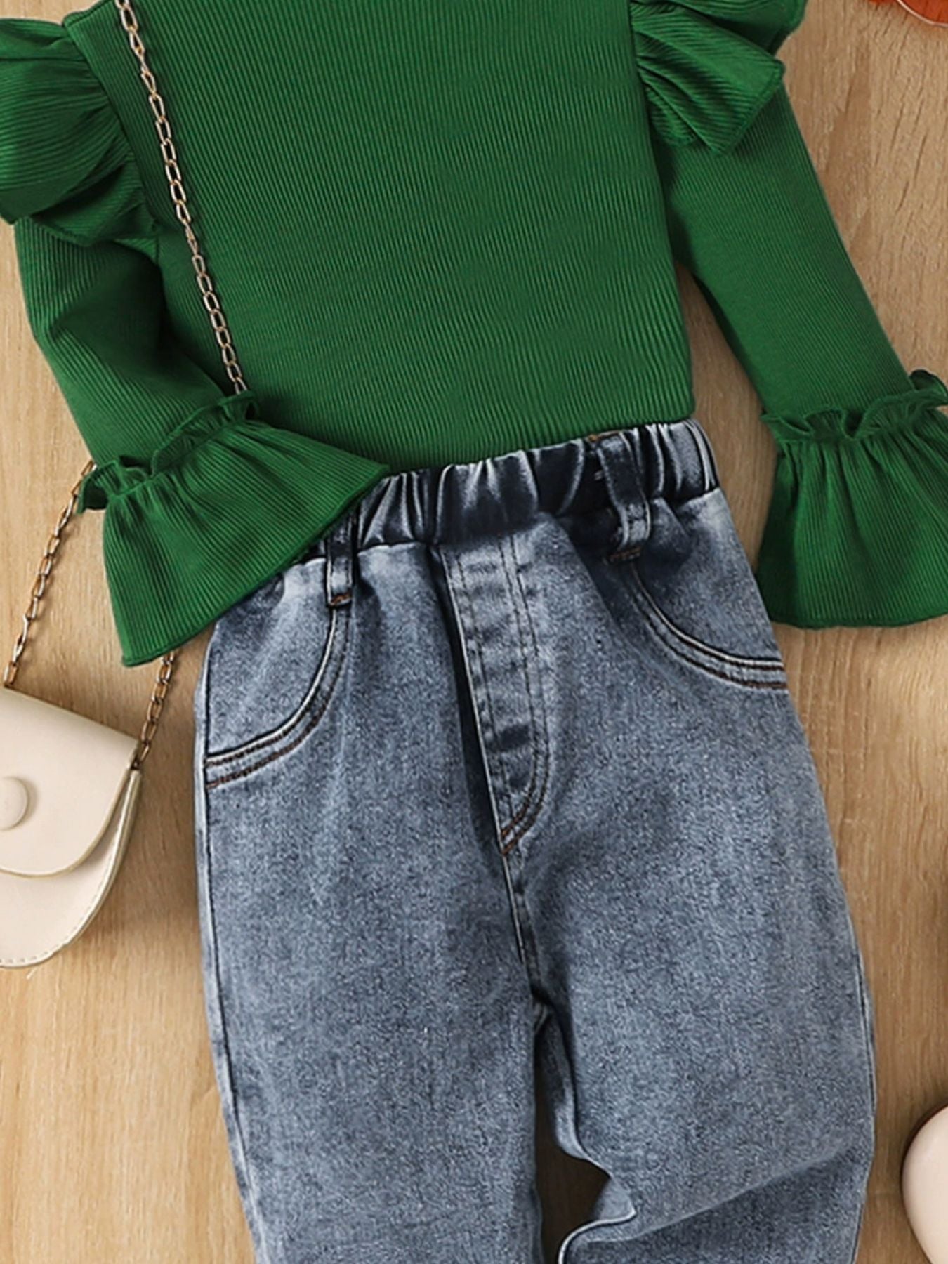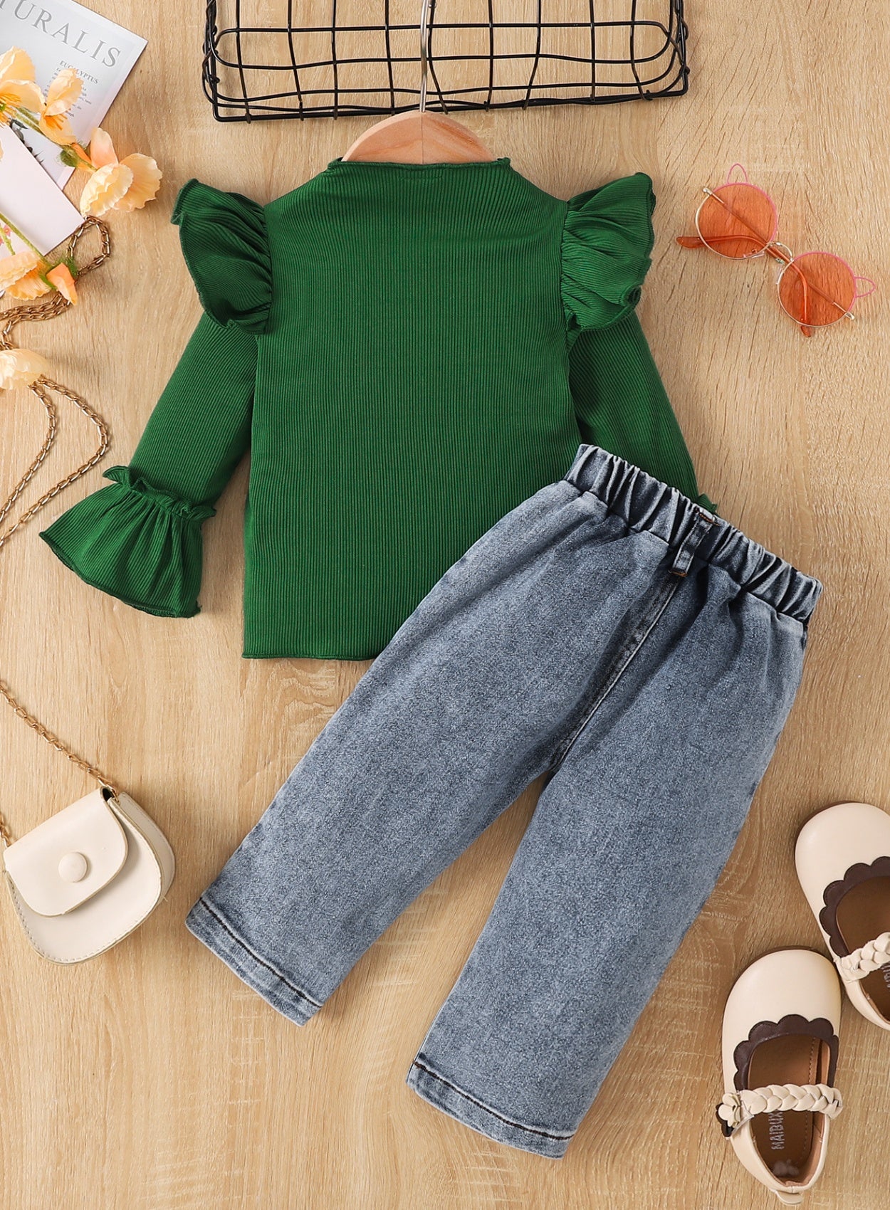 Children's Ruffle Trim Ribbed Top & Jeans Set