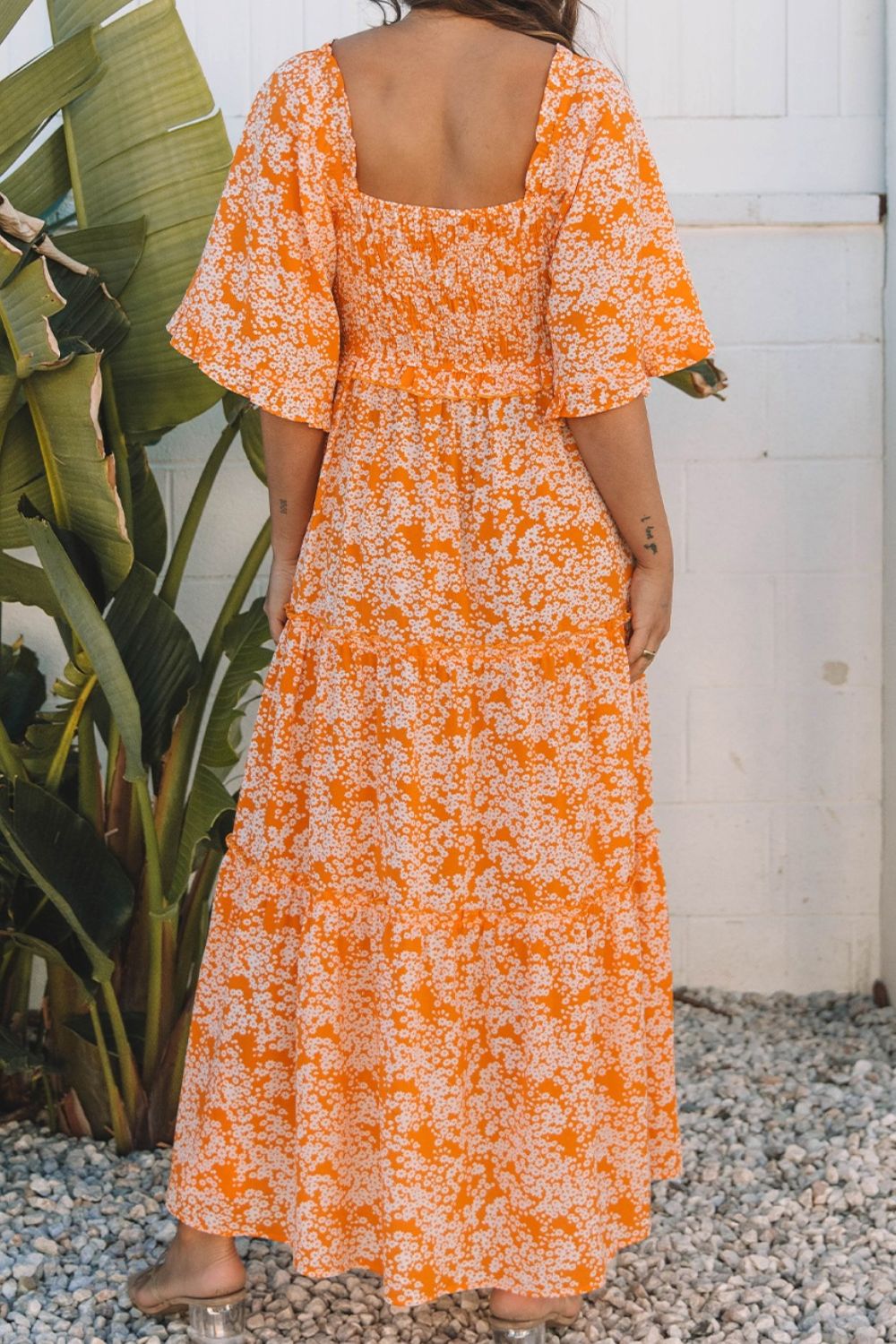 Floral Print Smocked V Neck Wide Sleeve Maxi Dress