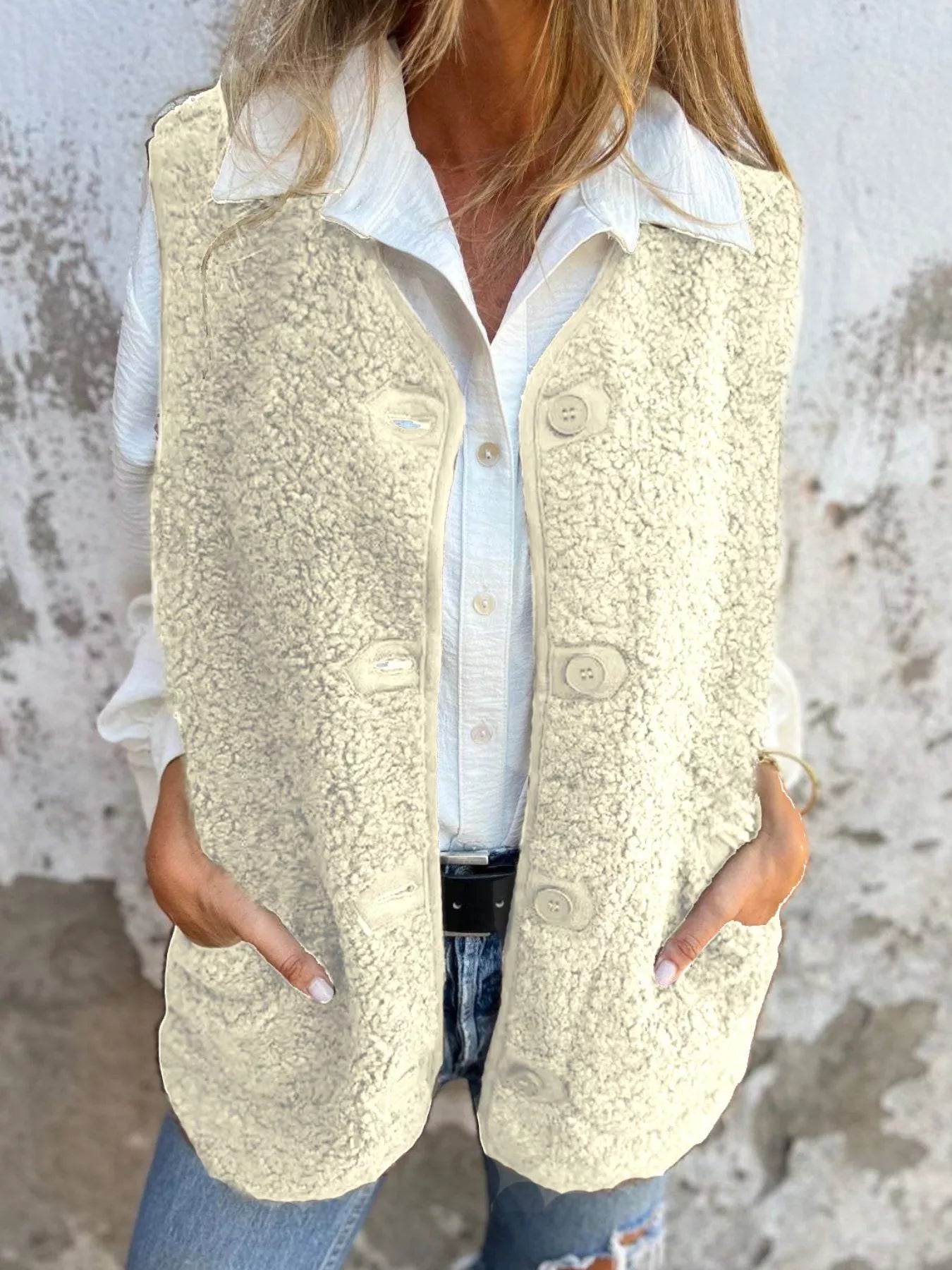 Full Size Cozy Sherpa Fleece Button-Up Vest Coat with Pockets Plus Size