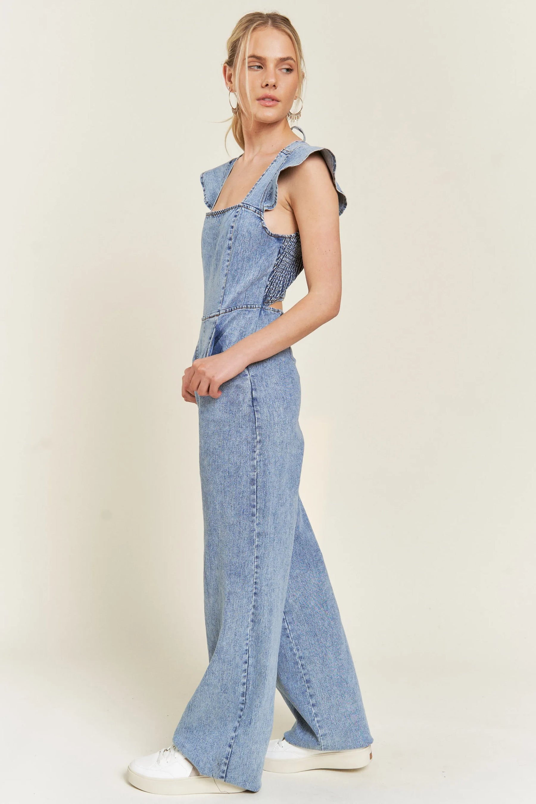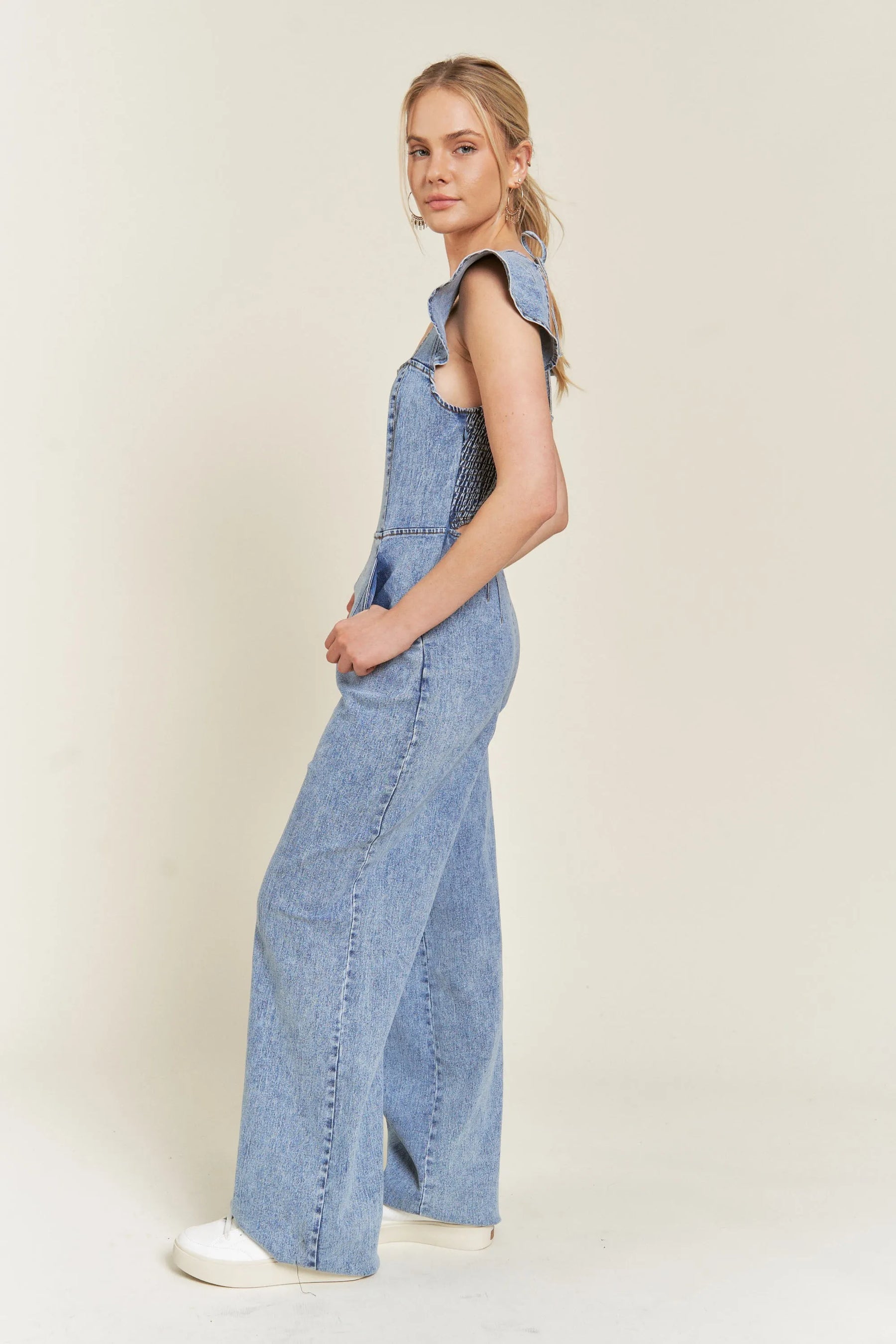 Jade By Jane Ruffled Wash Wide Leg Denim Jumpsuit