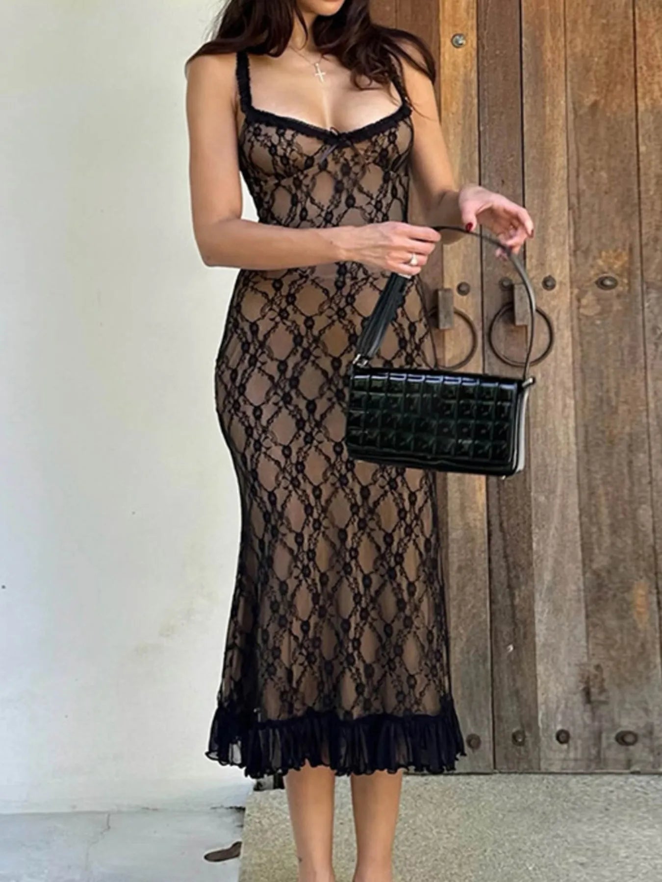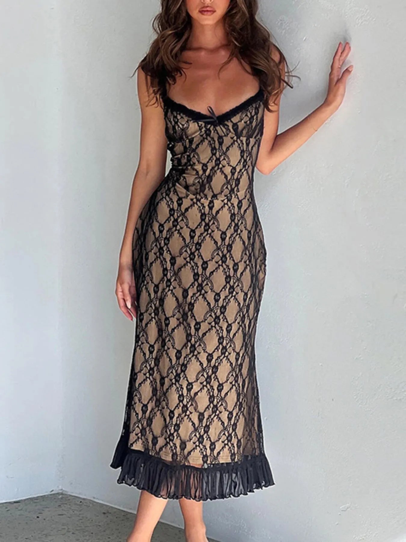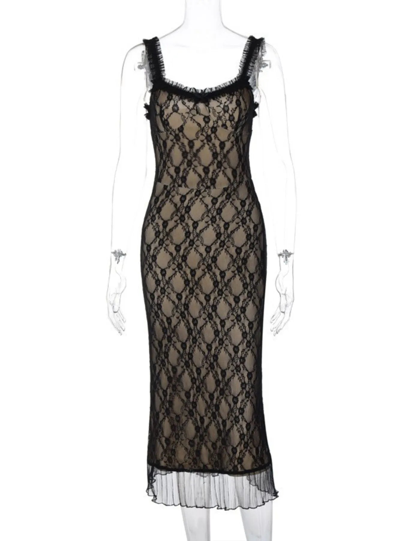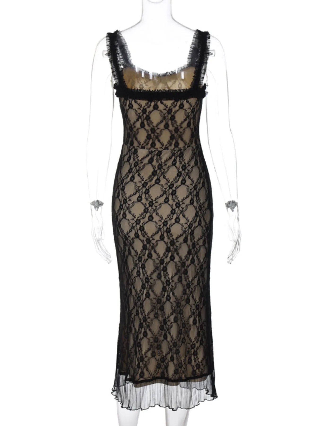 This stunning lace V-neck midi cami dress features an intricate black lace overlay on nude lining, creating an elegant contrast that highlights the feminine silhouette. The flattering V-neckline and adjustable thin straps offer both style and comfort, while the body-hugging fit accentuates curves beautifully. The midi length provides versatile styling options, and the unique fringe hem detail adds a touch of sophistication. Crafted from high-quality lace material with soft lining, this dress is perfect for evening events, cocktail parties, or romantic dinners. The sleeveless design makes it ideal for warmer weather, while the timeless black color ensures effortless elegance.