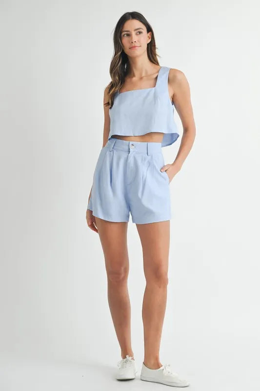 This sleeveless crop top and shorts set is perfect for staying cool and stylish during warm weather. The simple yet trendy design makes it easy to mix and match with other pieces in your wardrobe. Stay comfortable and chic all day long in this versatile ensemble.