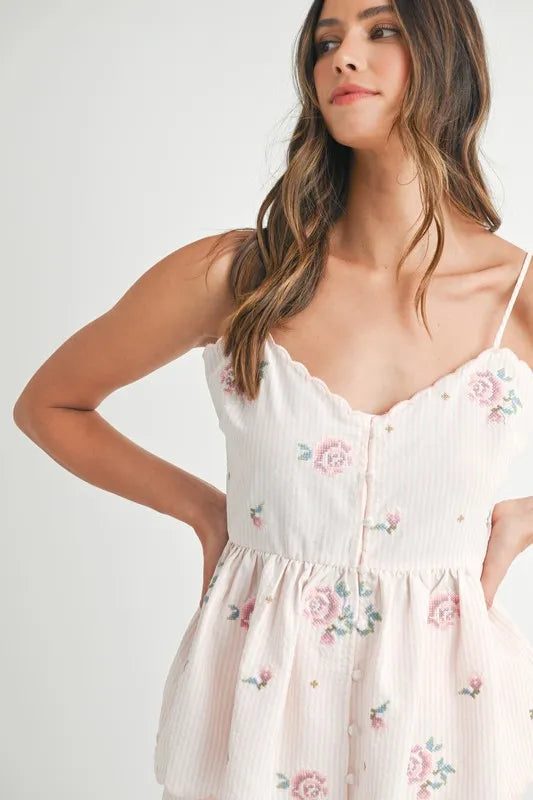 This charming set includes a stripe embroidered peplum cami and matching shorts. The cami features delicate embroidery for a touch of elegance, while the peplum design adds a flattering silhouette. Paired with the coordinating shorts, this set is perfect for a summery and stylish look for various occasions.