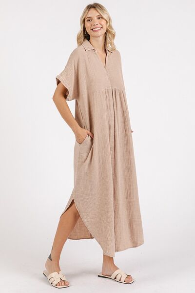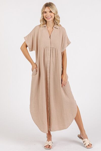 Mittoshop Mineral Wash V Neck Button Up Midi Shirt Dress