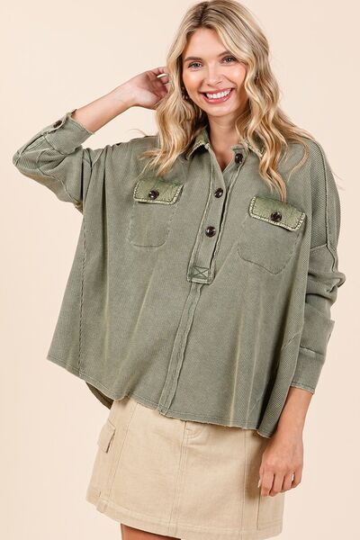 Mittoshop Mineral Wash Waffle Knit Collared Neck Henley Top