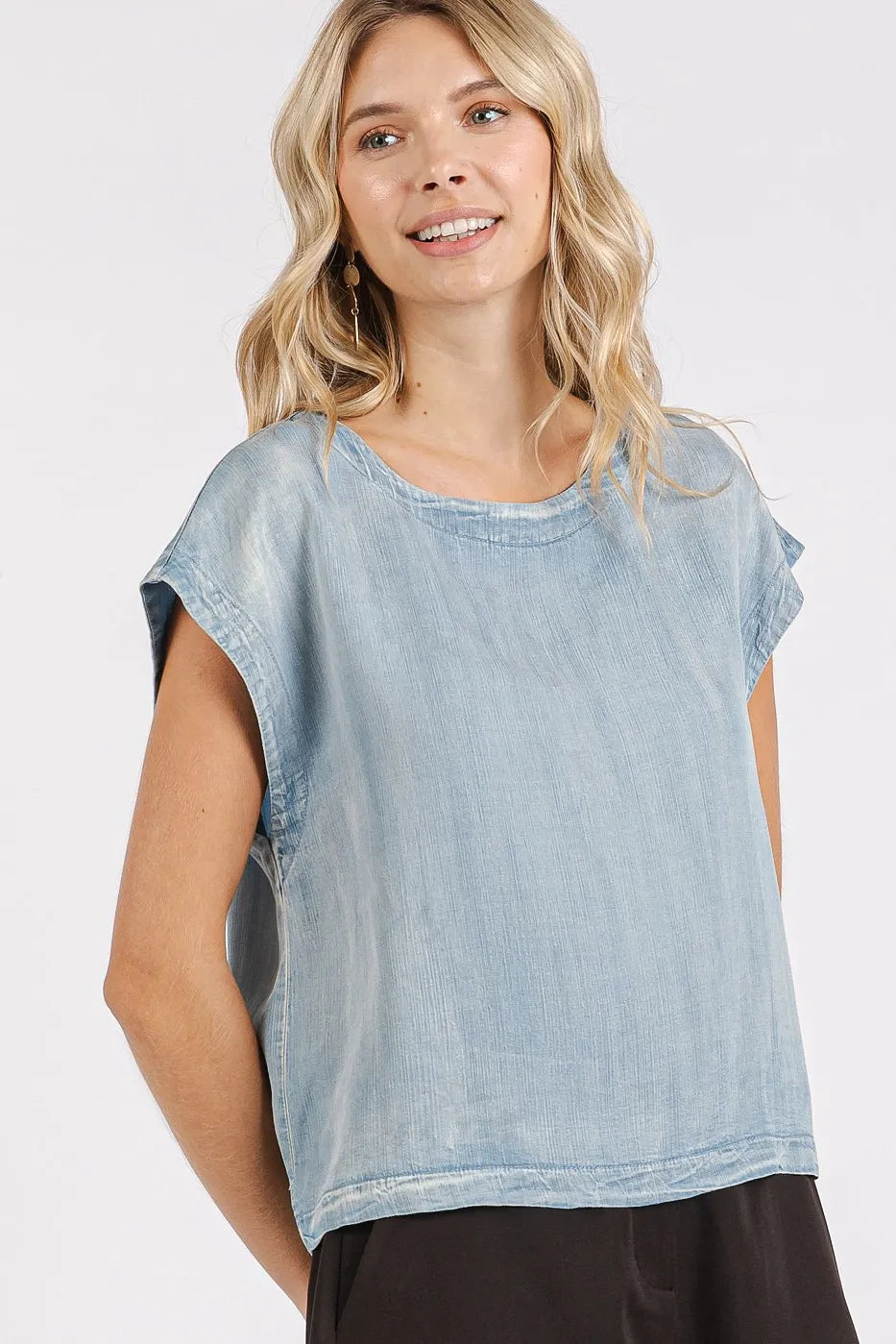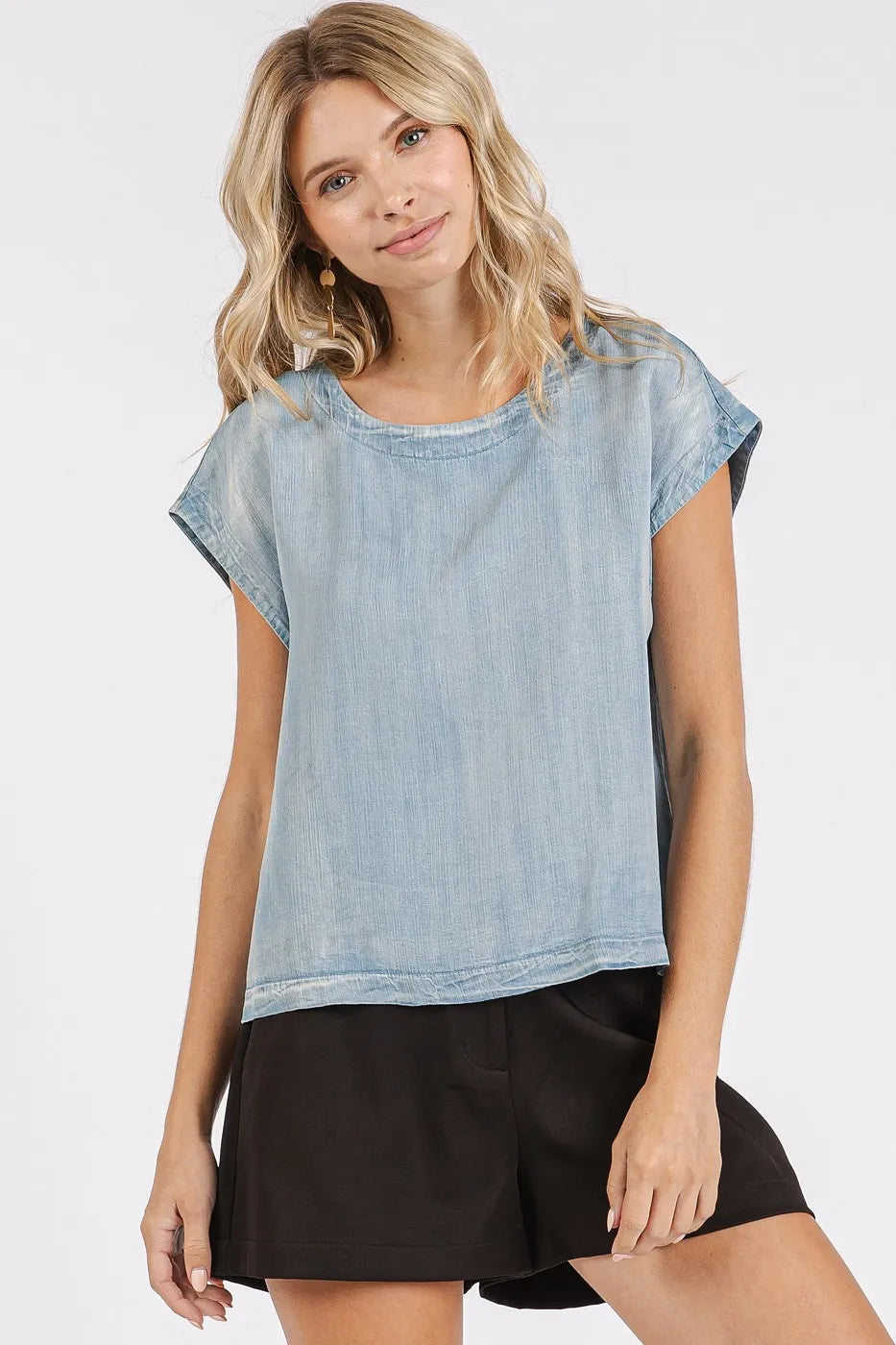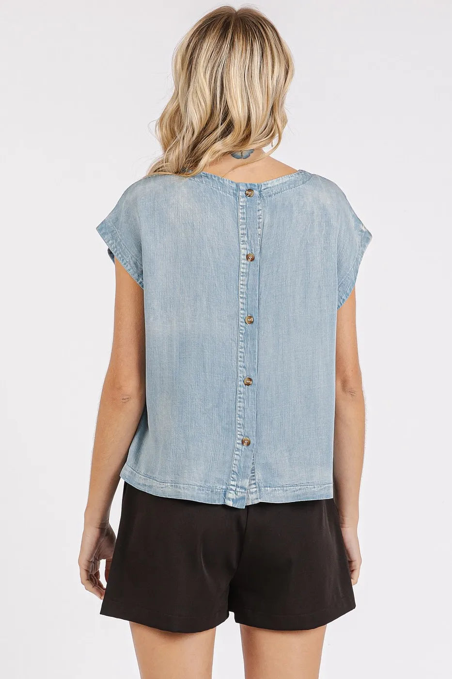 Elevate your casual style with this washed chambray back button cap sleeve top. The back button detail adds a unique and stylish touch to this classic chambray top. With cap sleeves, it's perfect for warmer days and can be dressed up or down. Pair it with white jeans or denim shorts for a chic and effortless summer look.