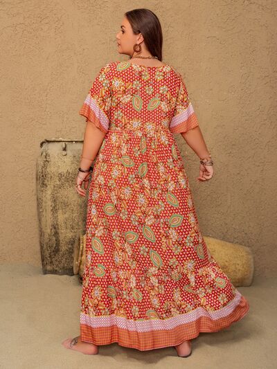 Plus Size Printed Tie Neck Flutter Sleeve Maxi Dress