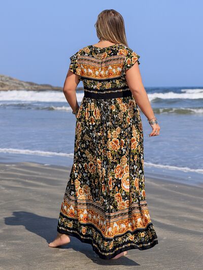 Plus Size Printed V-Neck Ruffle Cap Sleeve Maxi Dress