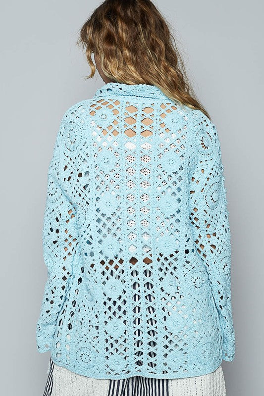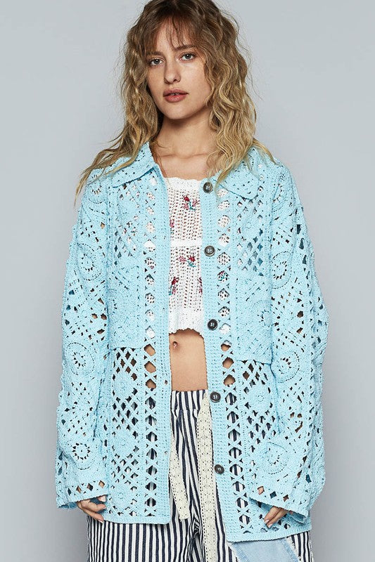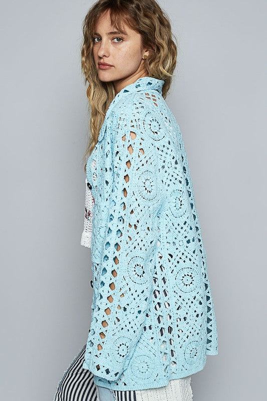 POL Crochet Button Up Cardigan with Chest Patch Pockets