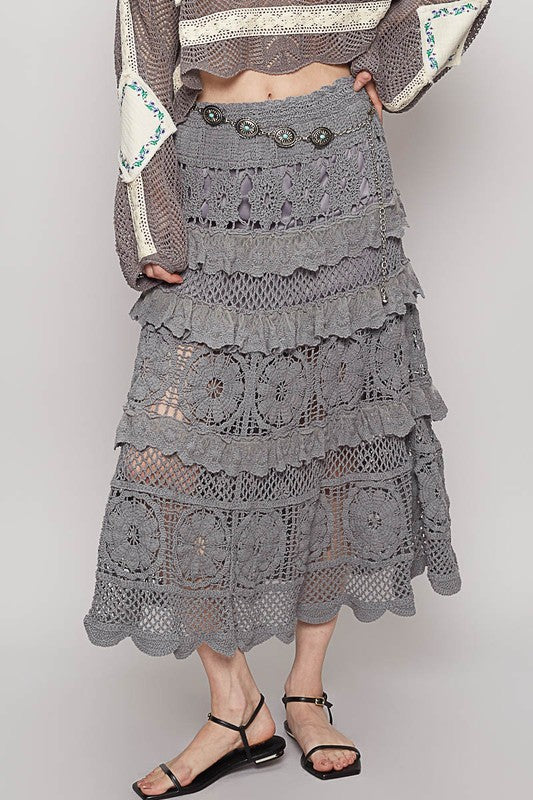 POL Crochet Lace Ruffled Midi Skirt