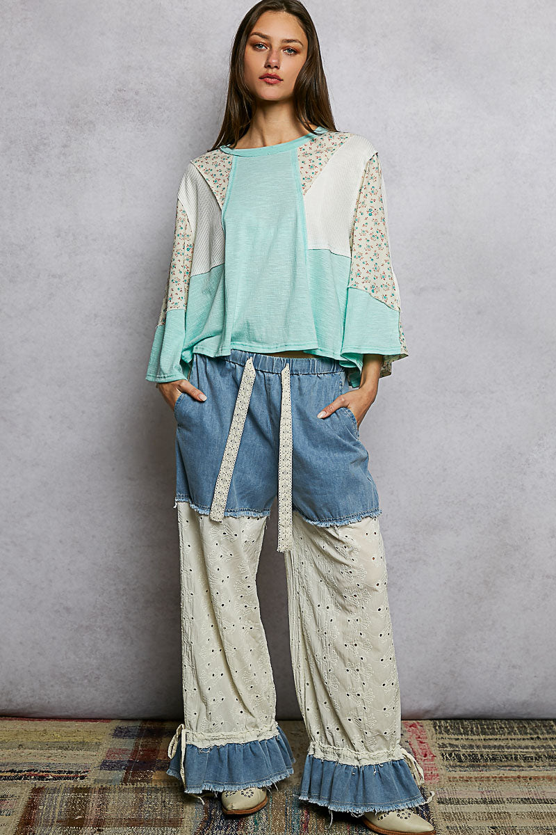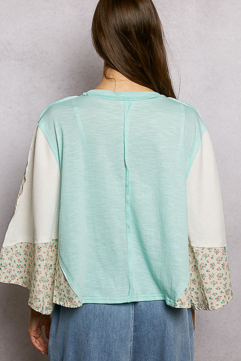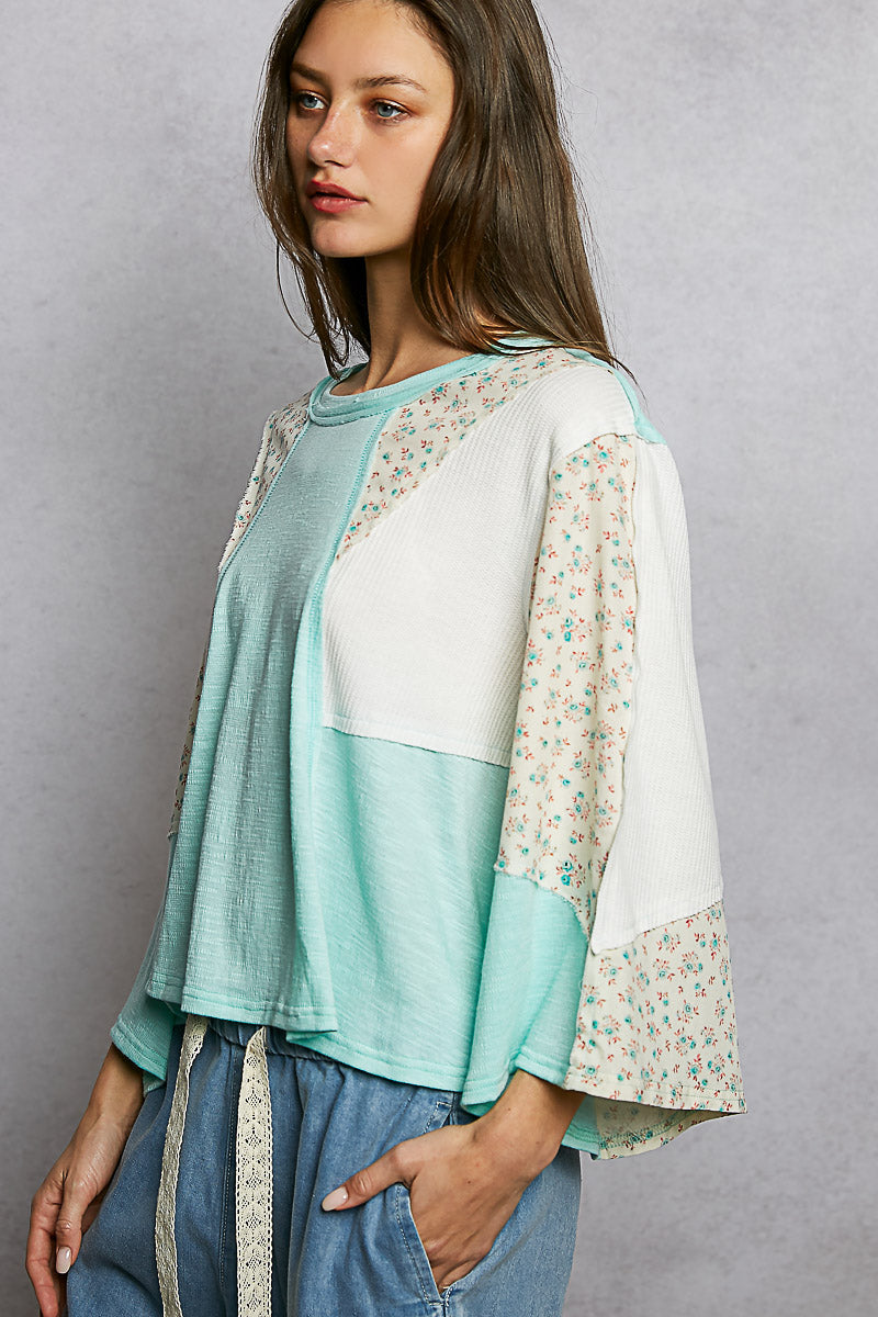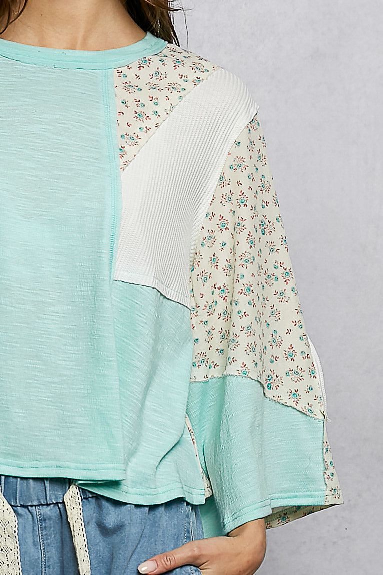 POL Exposed Seam Floral Patchwork Round Neck Textured Slub Knit Top