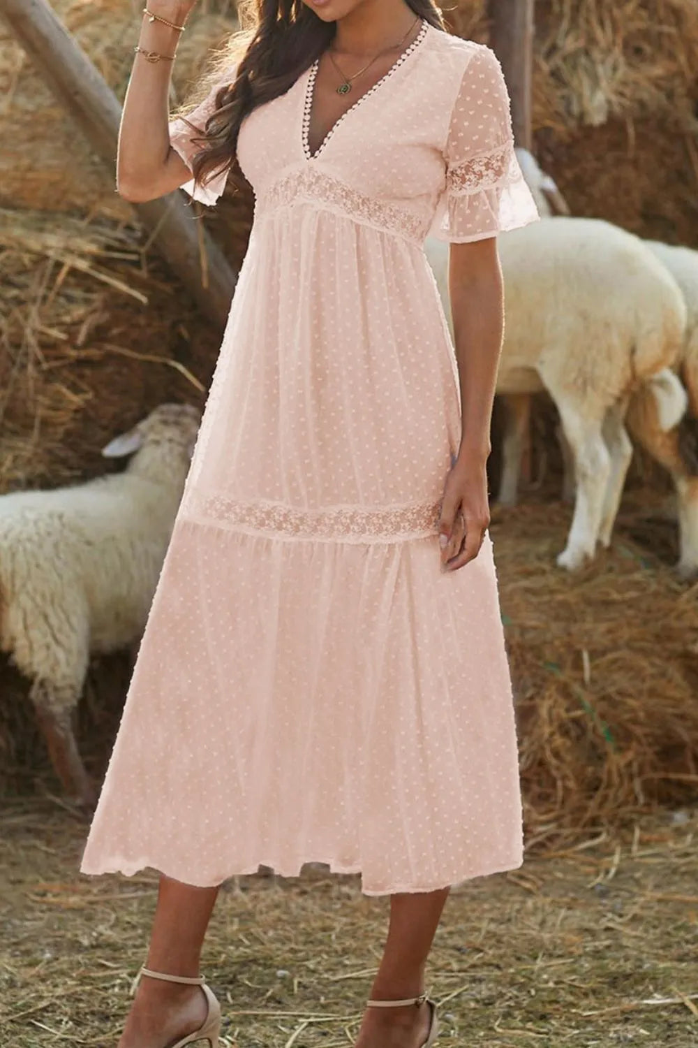 Polka Dot V-Neck Ruffle Midi Dress