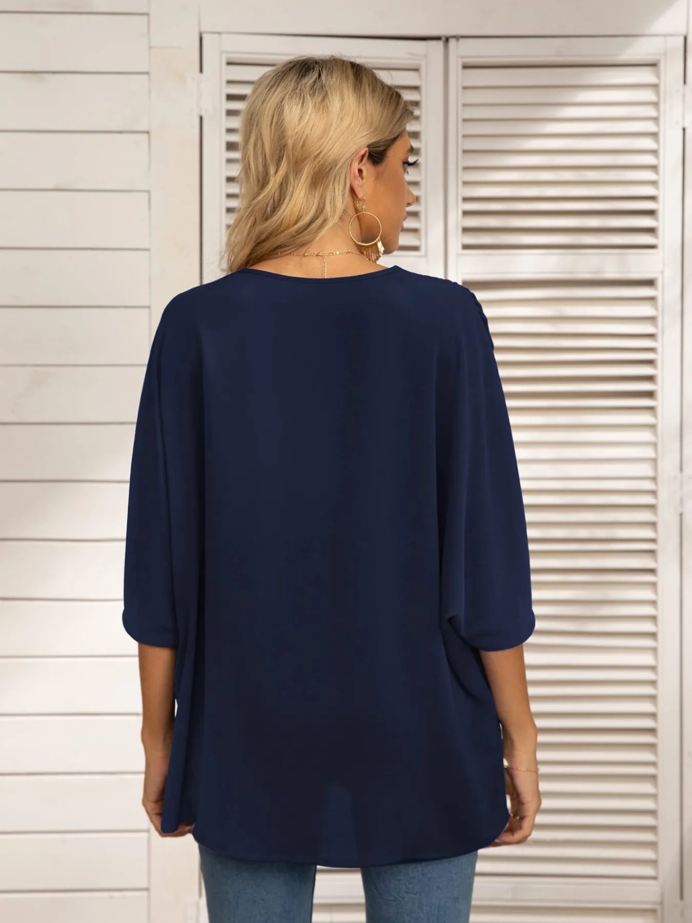 Printed Trim V-Neck Batwing Sleeve Blouse
