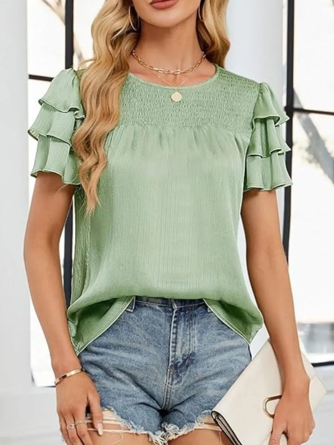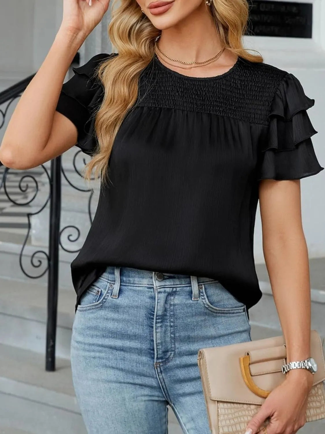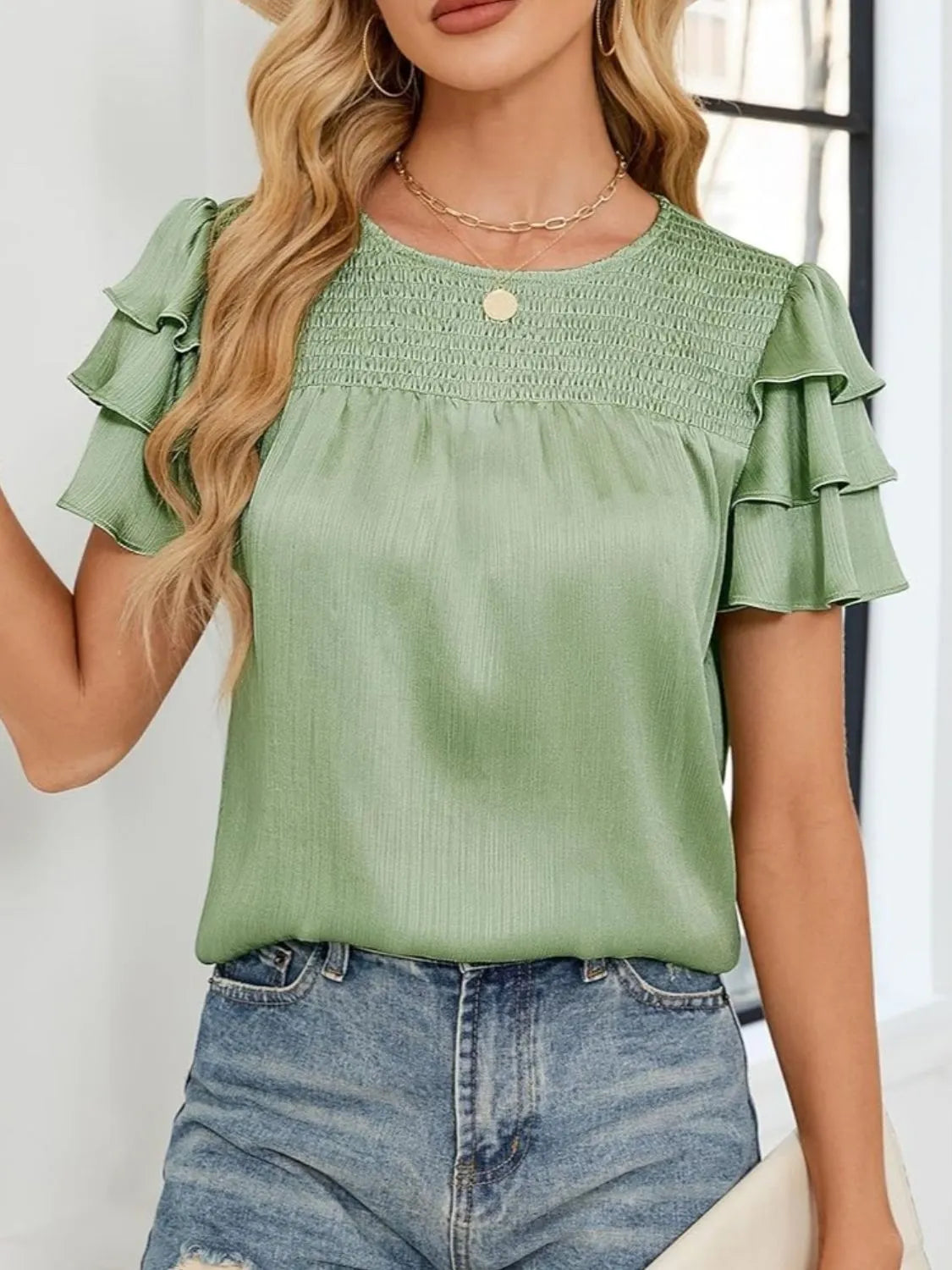 Smocked Round Neck Ruffled Layered Sleeve Blouse