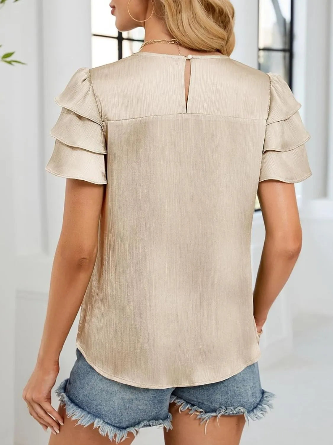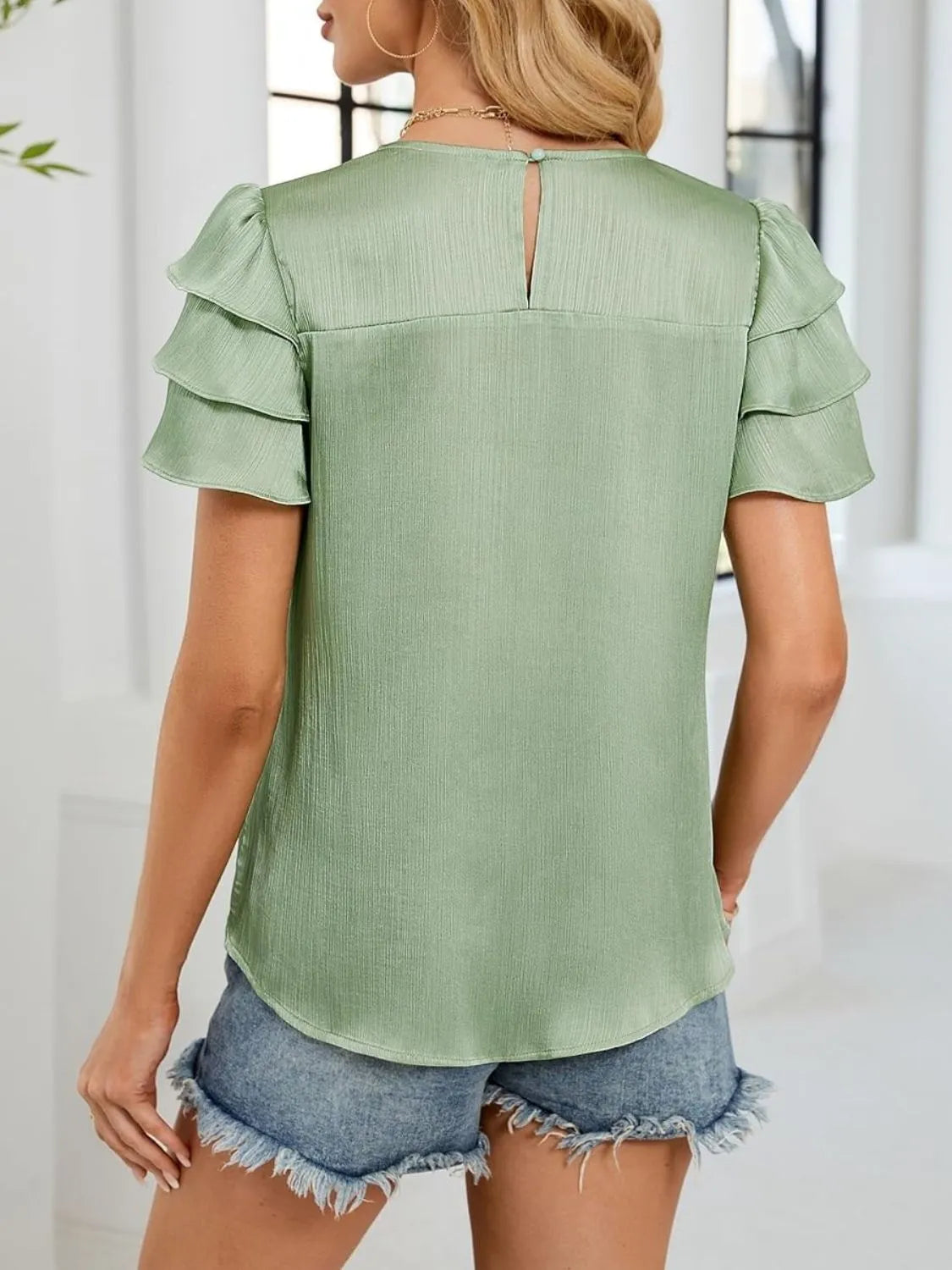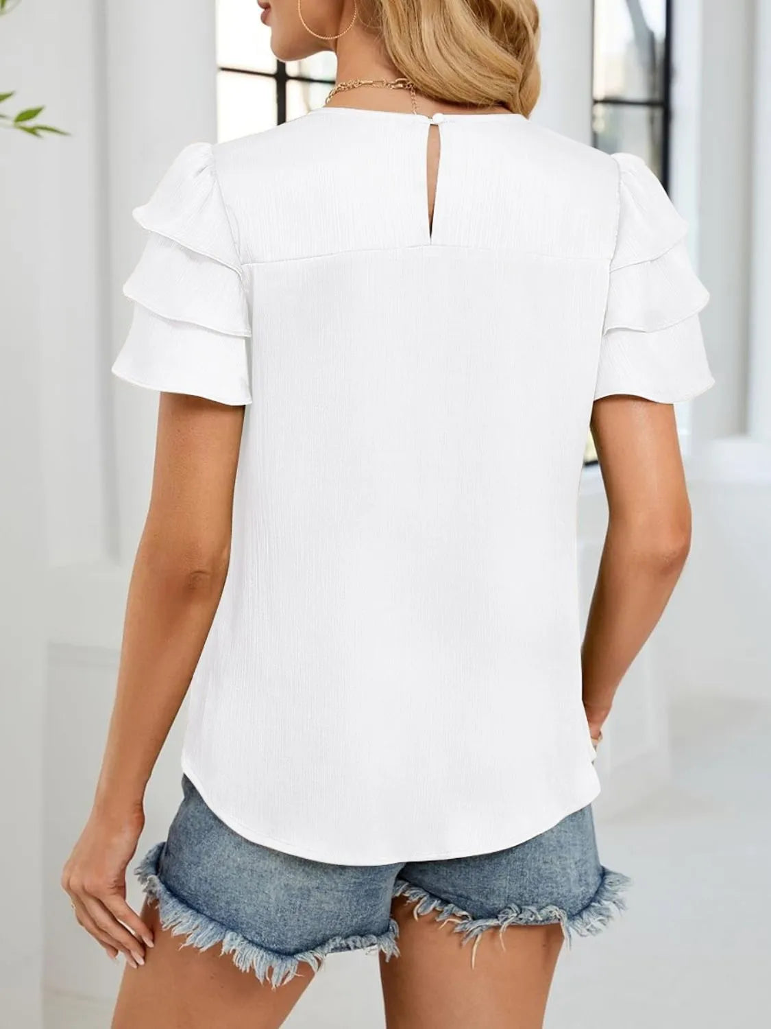 Smocked Round Neck Ruffled Layered Sleeve Blouse