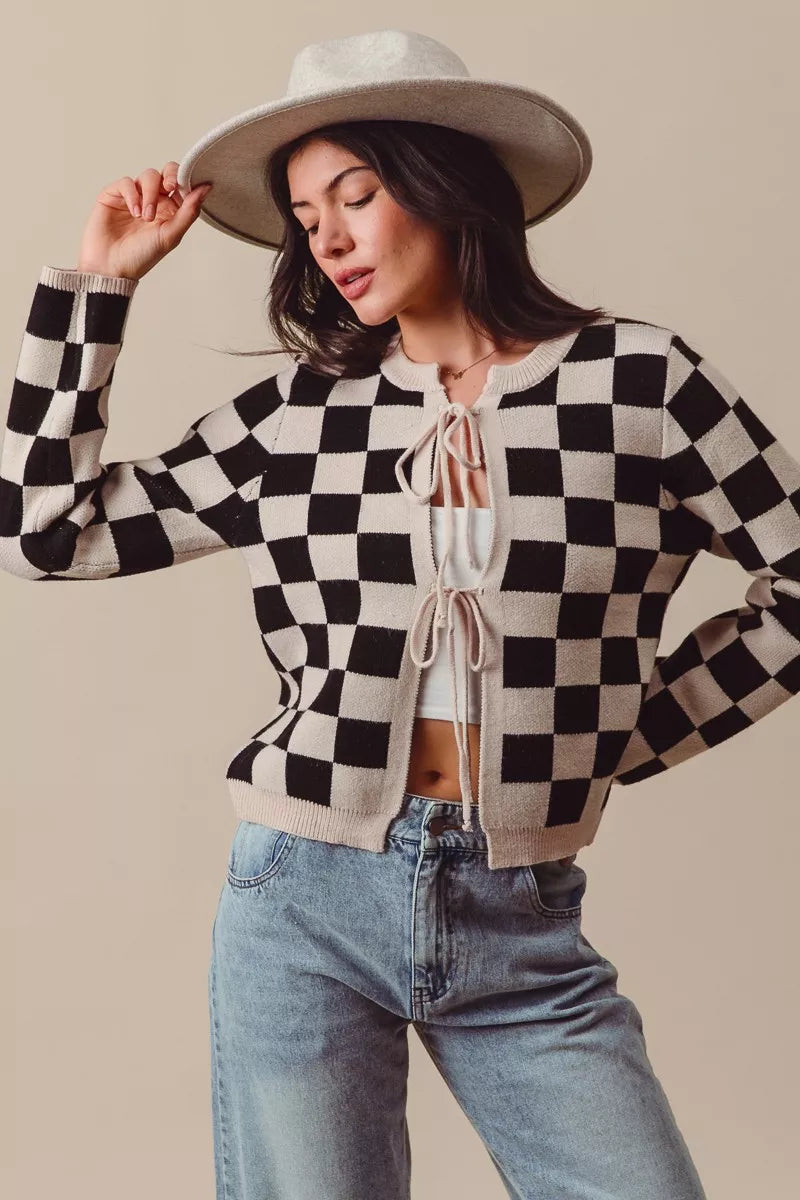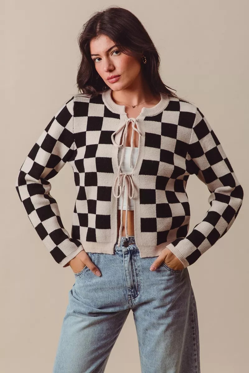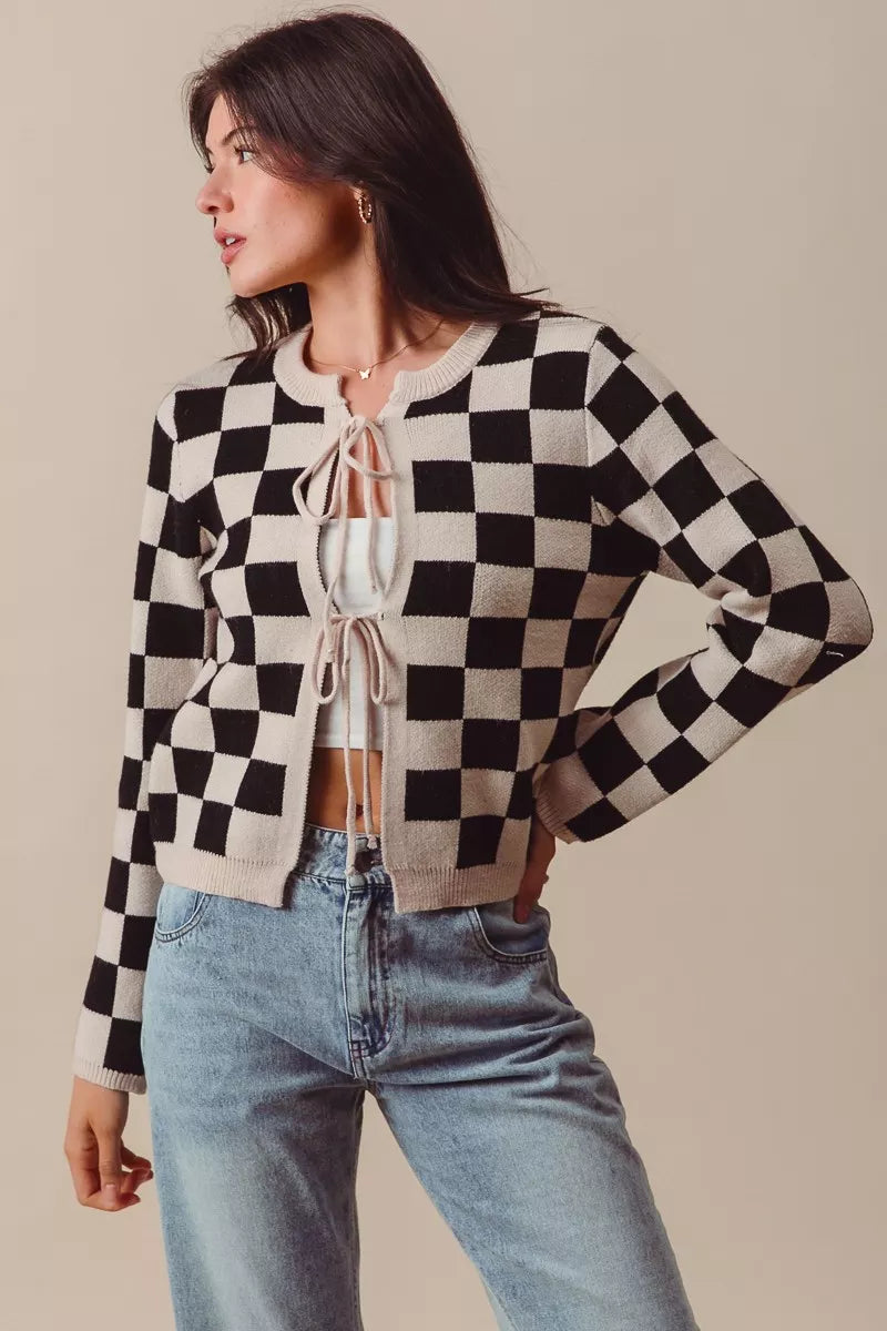 SO ME Tie Front Checkered Knitted Round Neck Cardigan