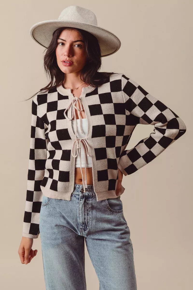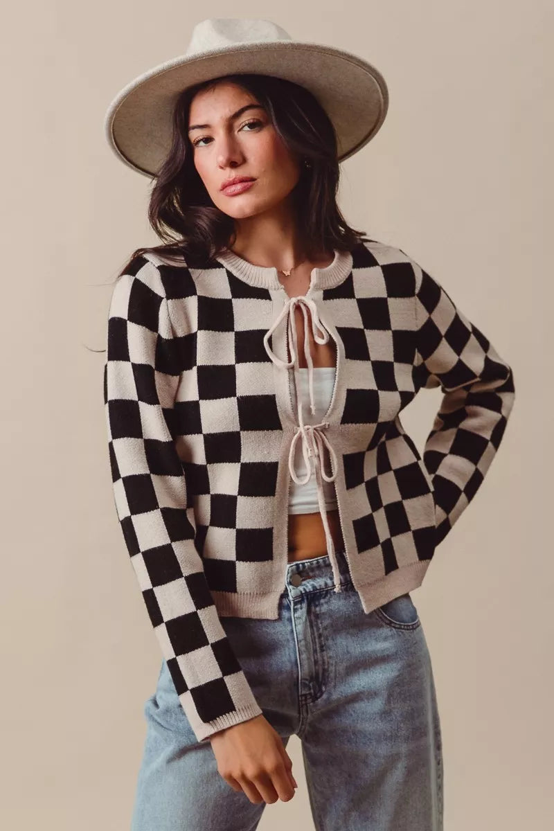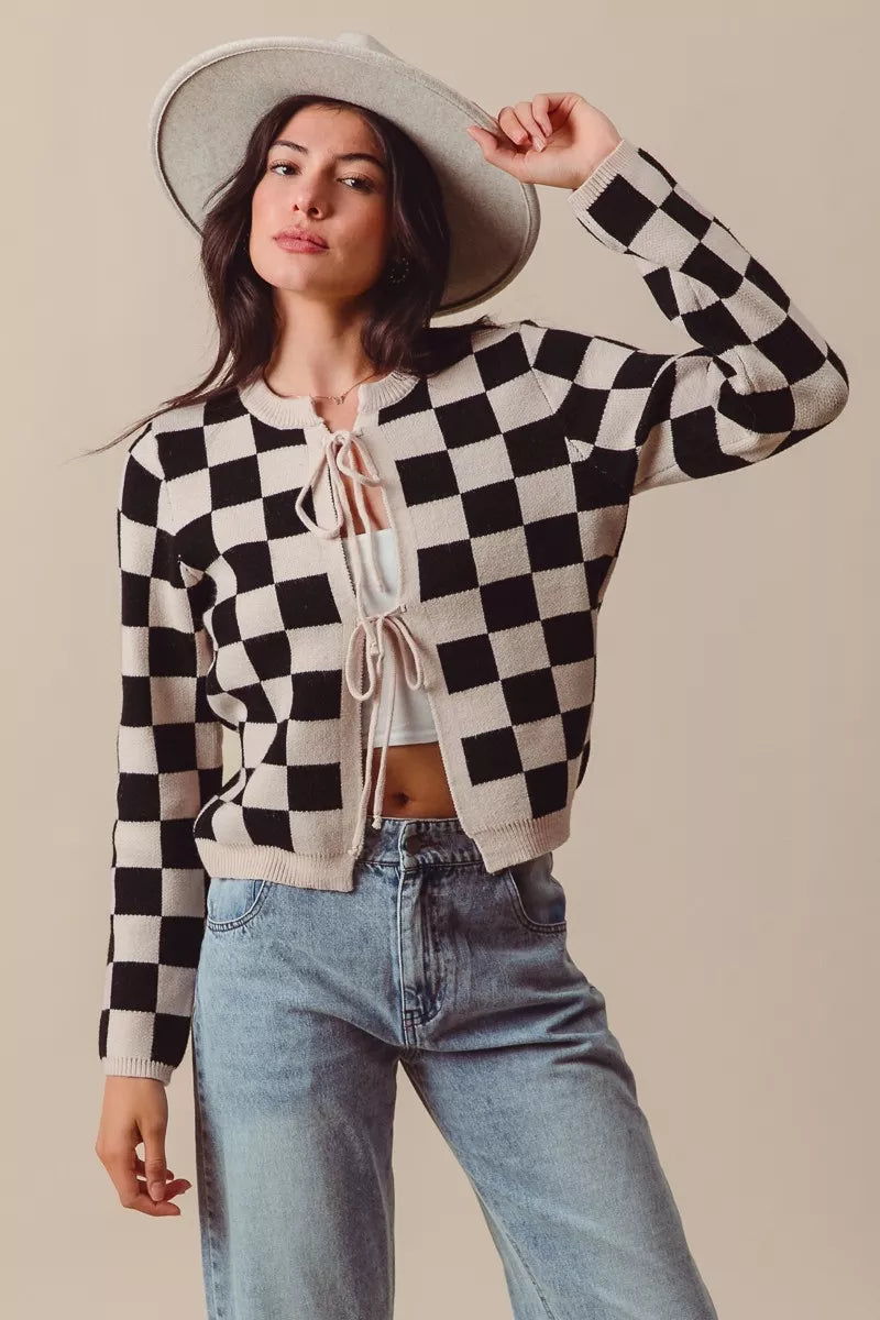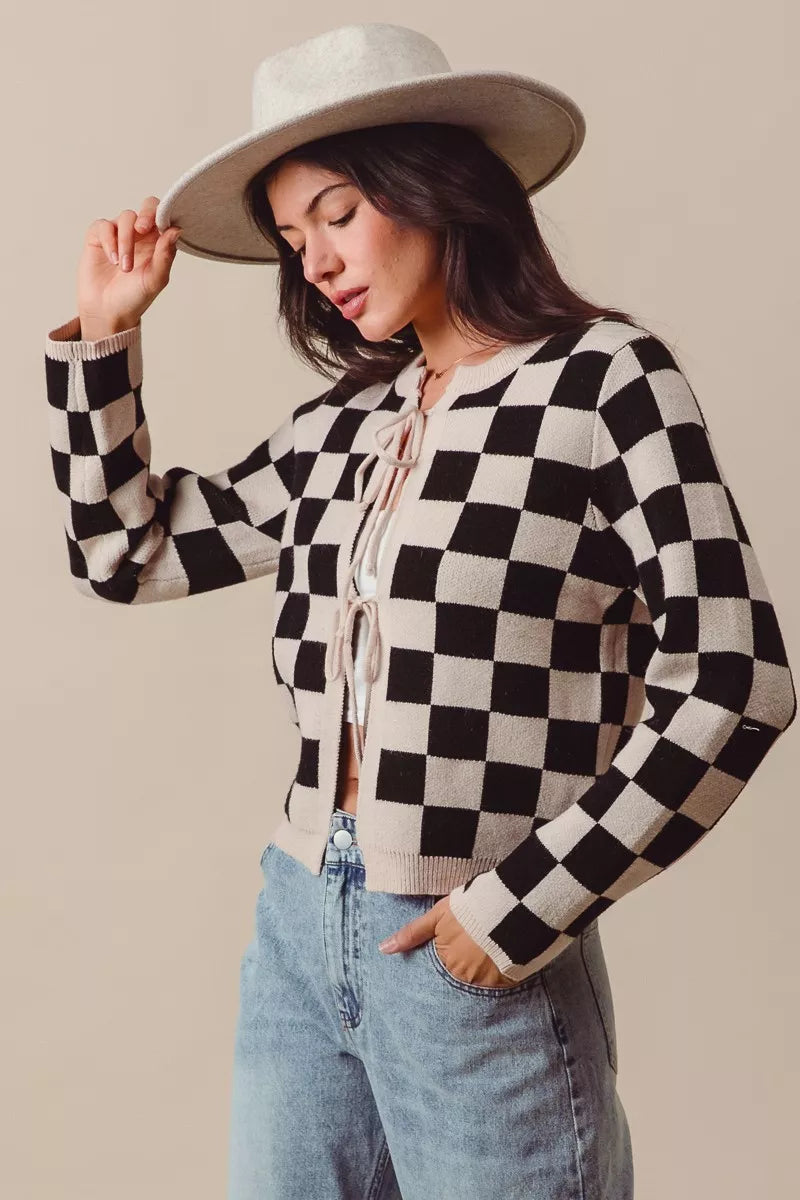 SO ME Tie Front Checkered Knitted Round Neck Cardigan