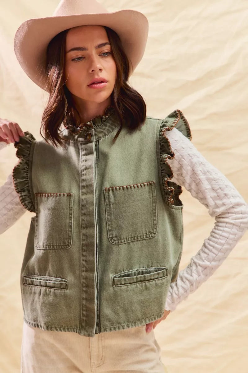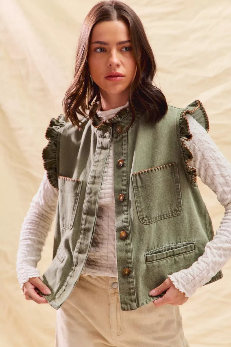 SO ME Washed Denim Stitch Ruffled Hidden Button Vest Top