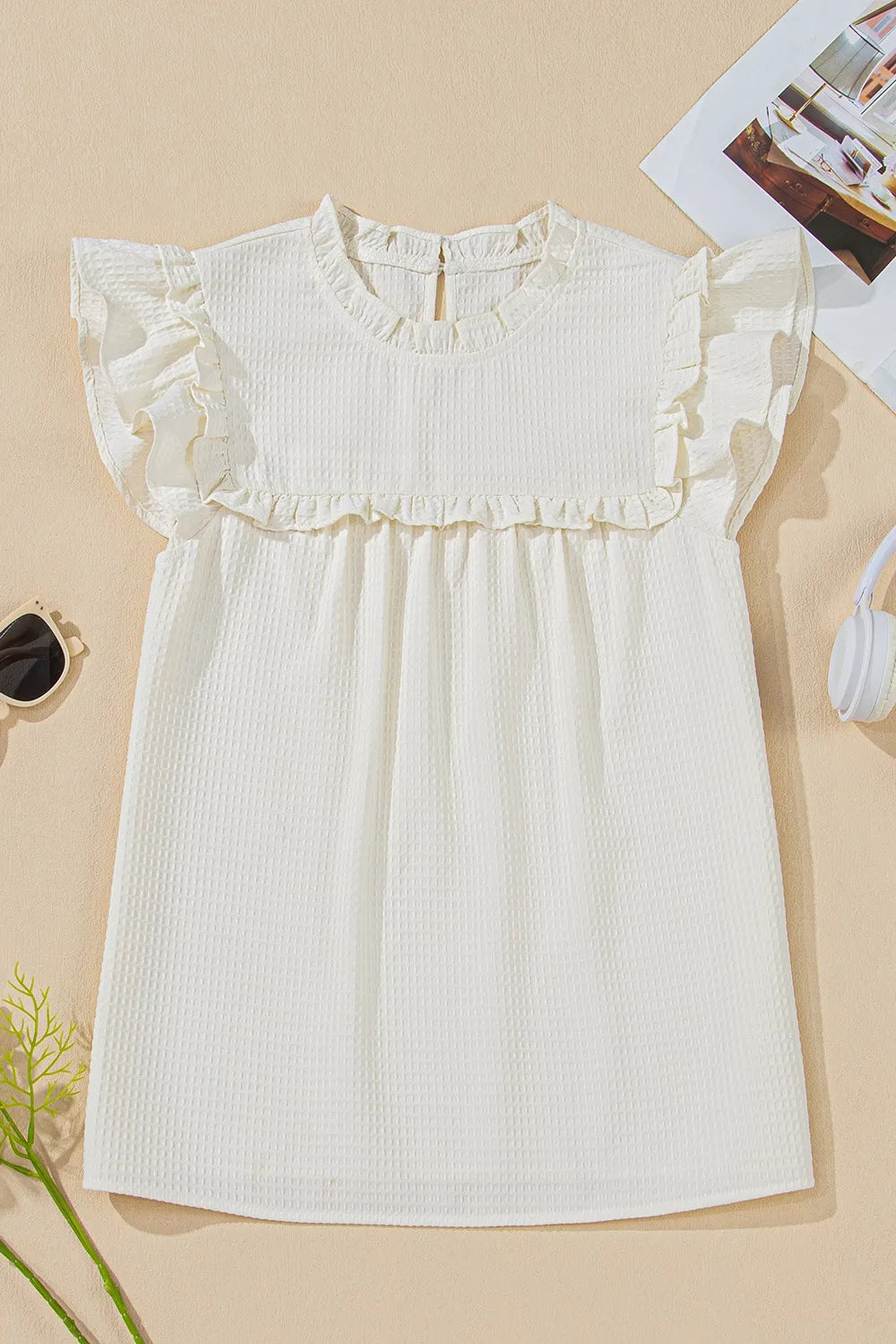 Solid Color Ruffle Trim Waffle Knit Blouse