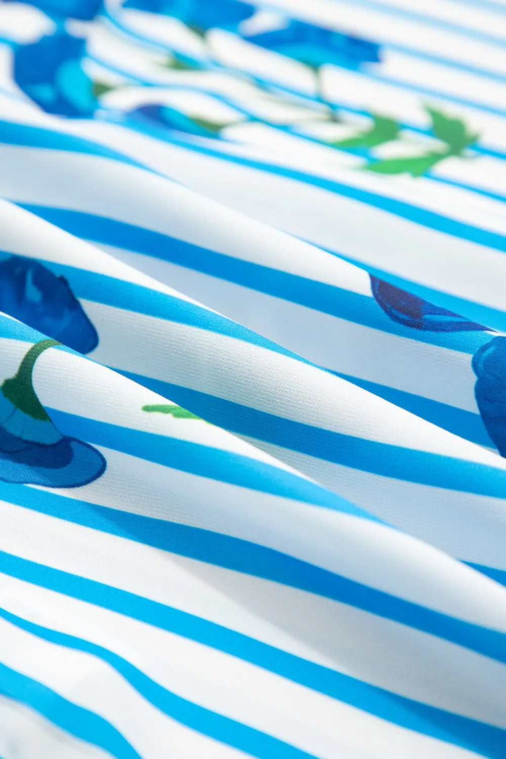 Stripe Floral Notched Neck Puff Sleeve Summer Blouse