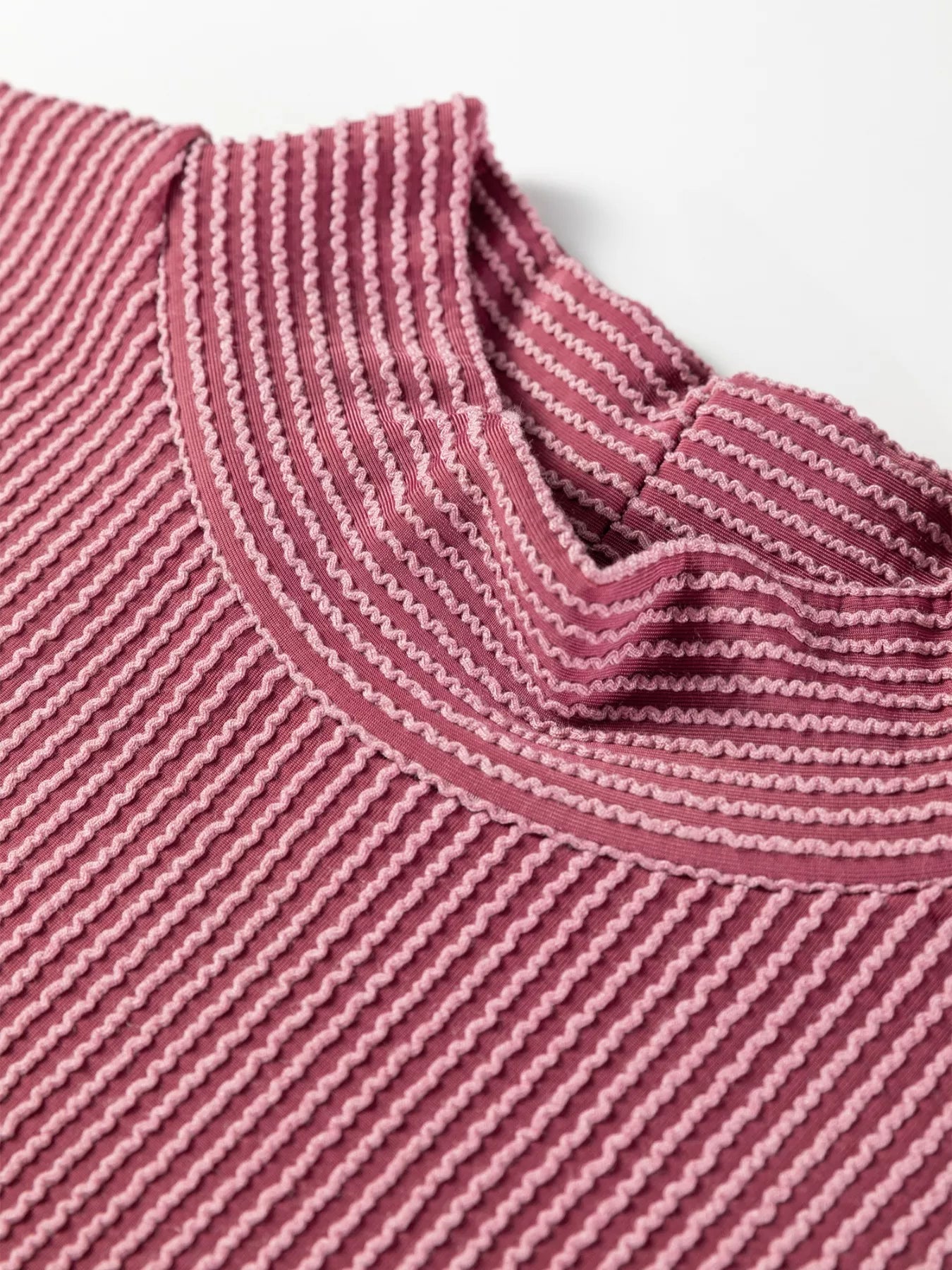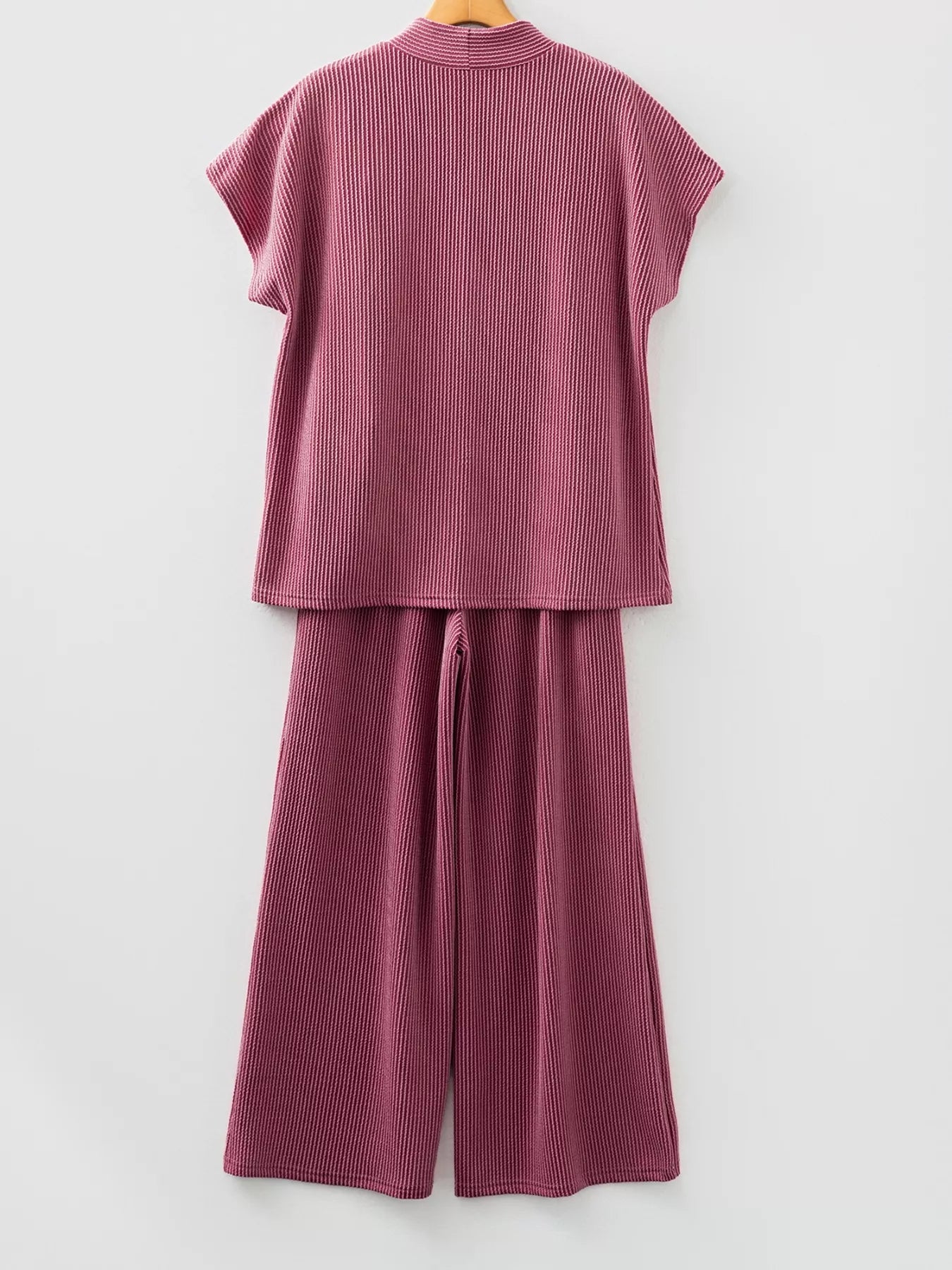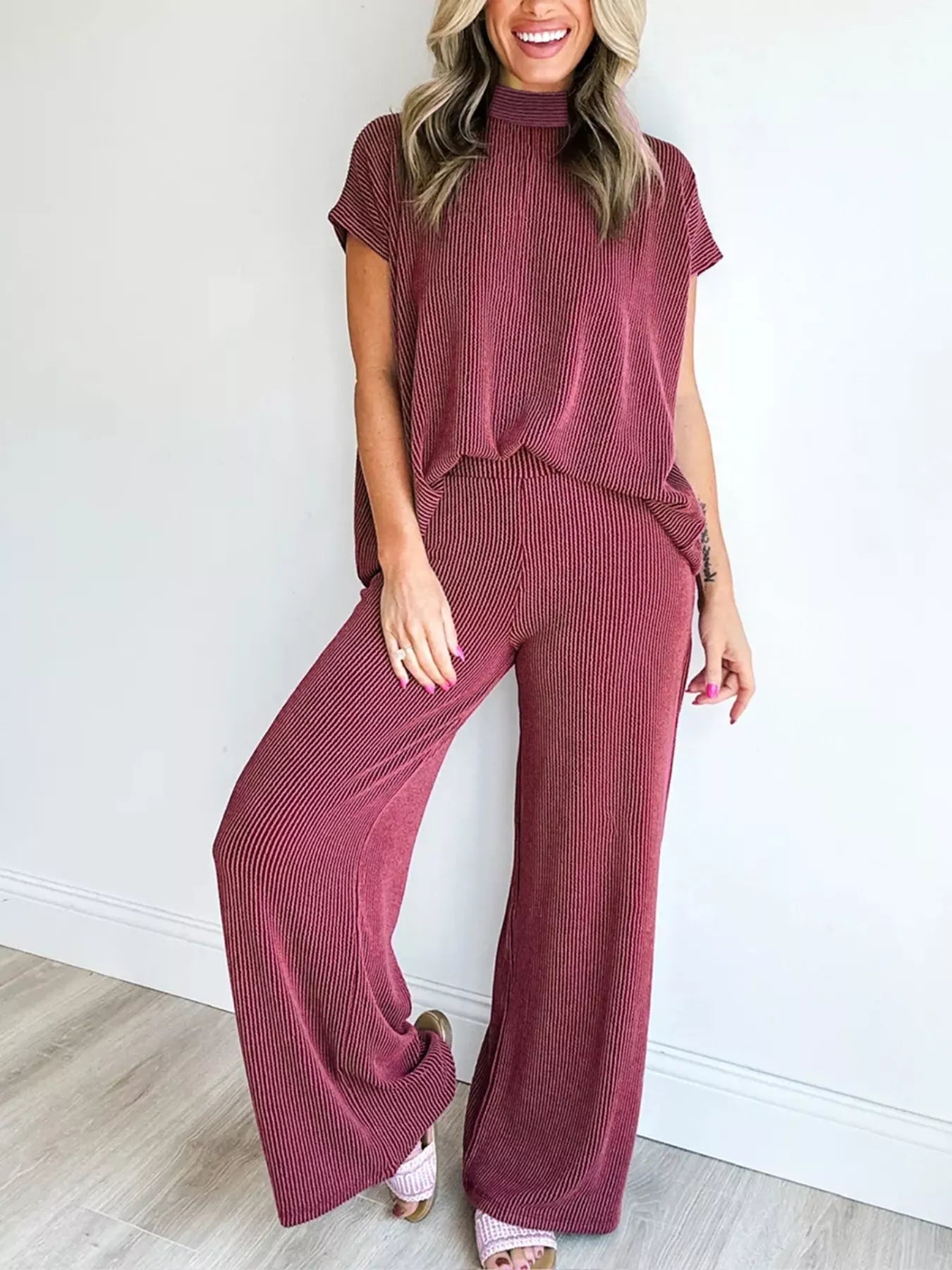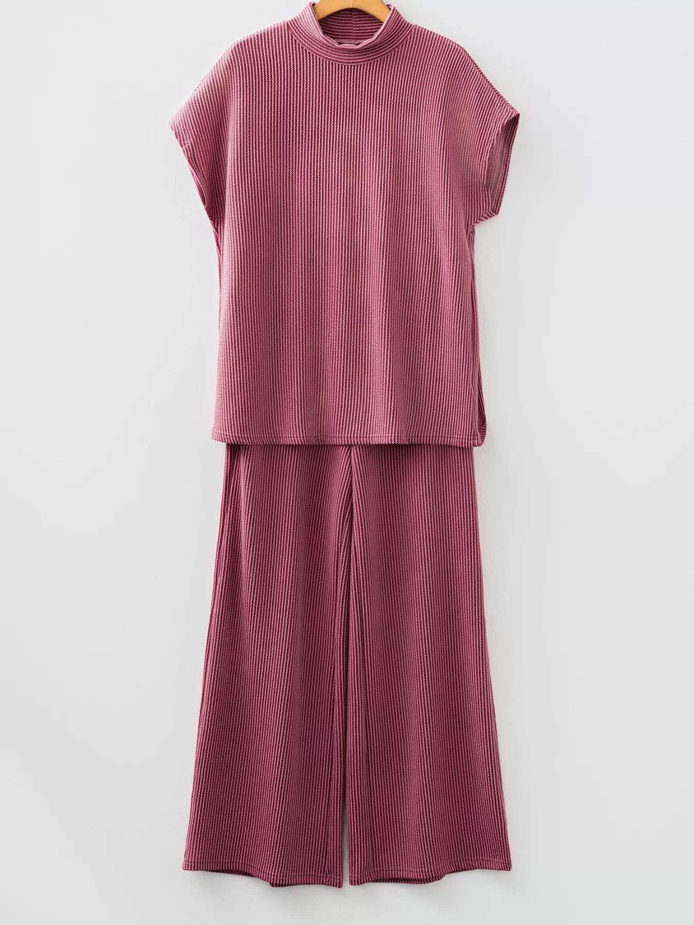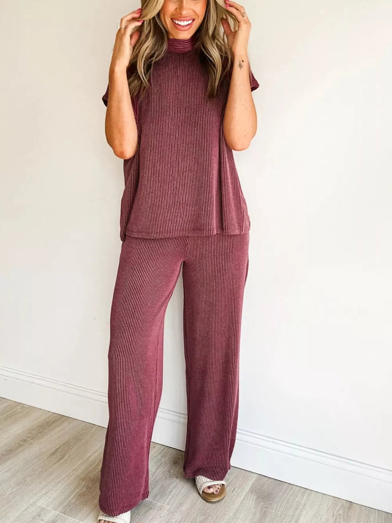 Twisted Ribbed High Neck Loose Tee Elastic High Waist Loose Pant Set