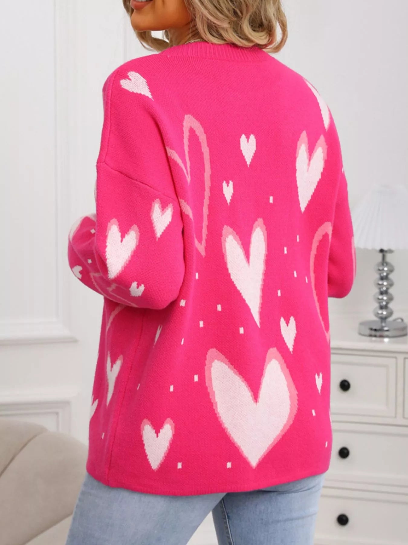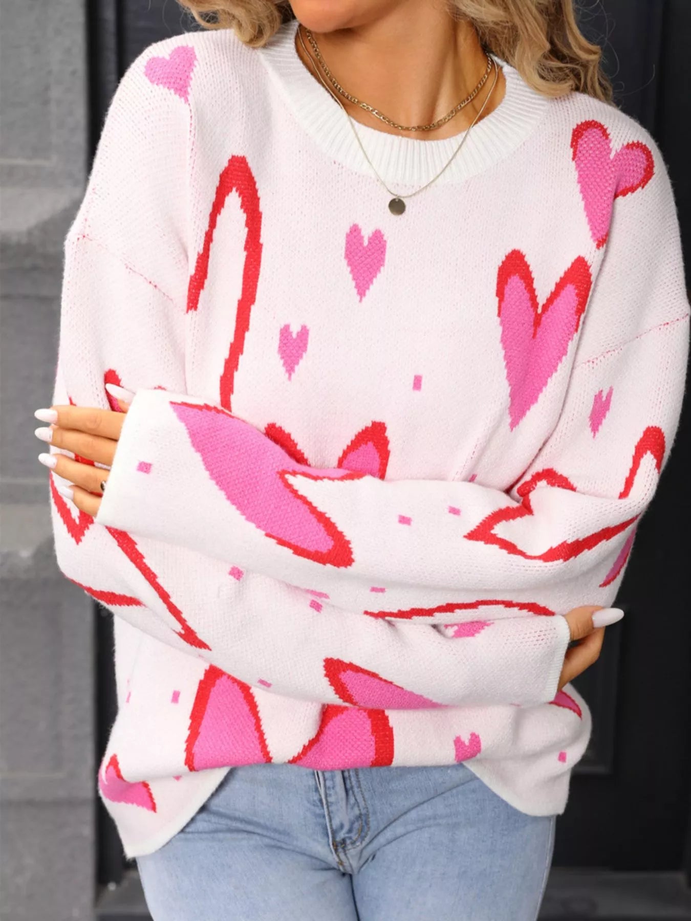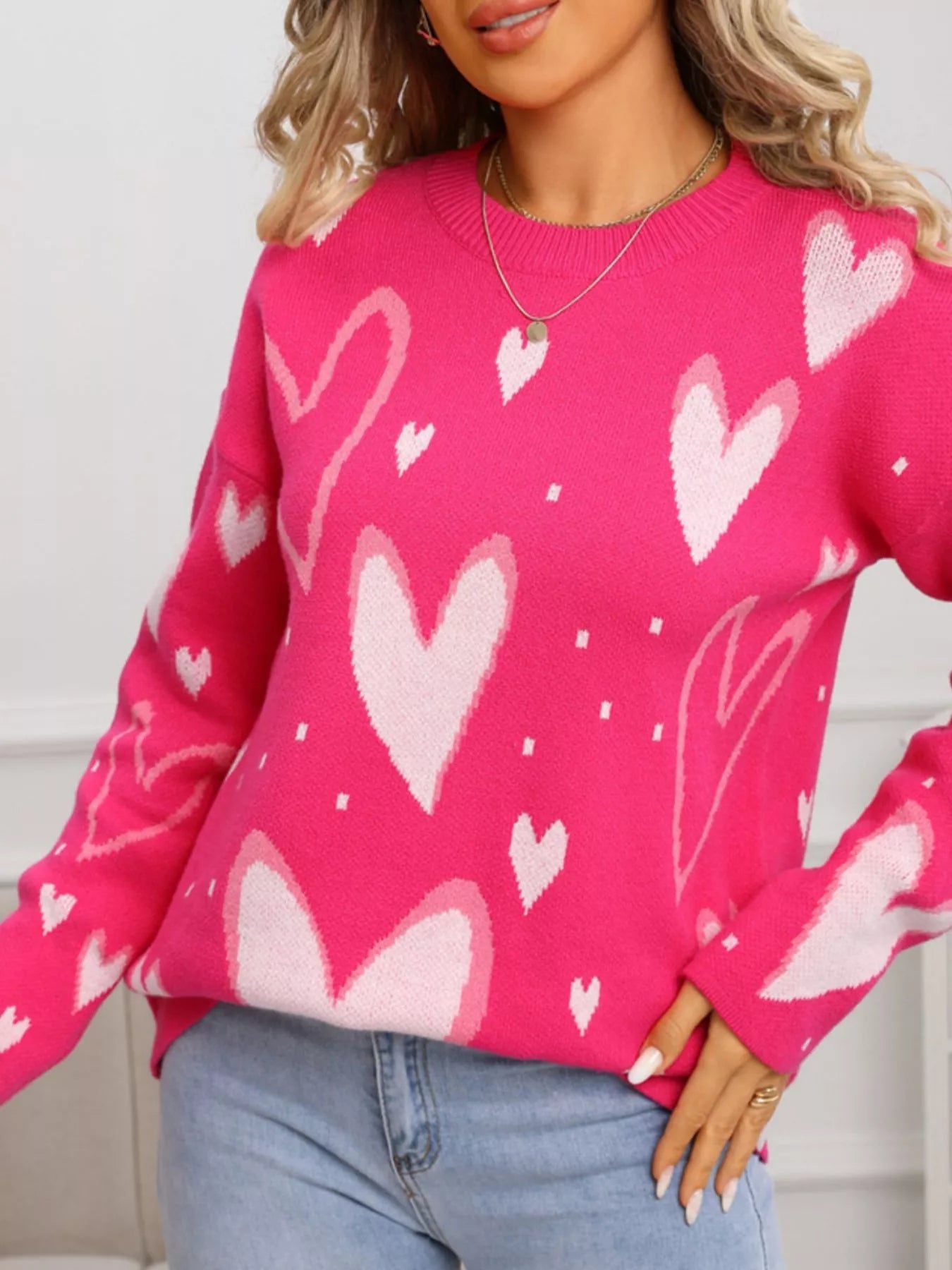 Valentine's Day Heart Round Neck Dropped Shoulder Sweater