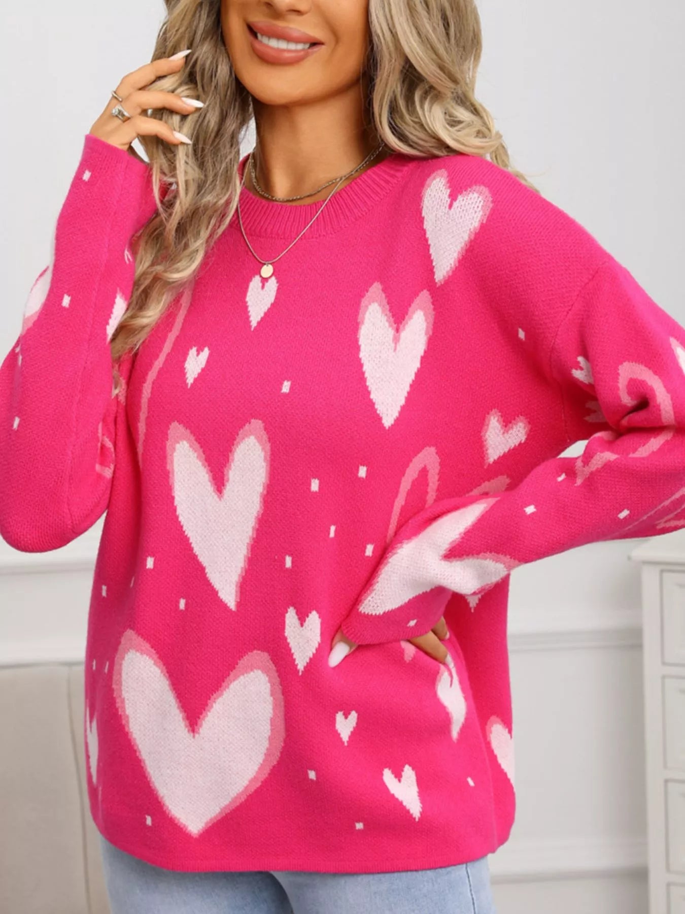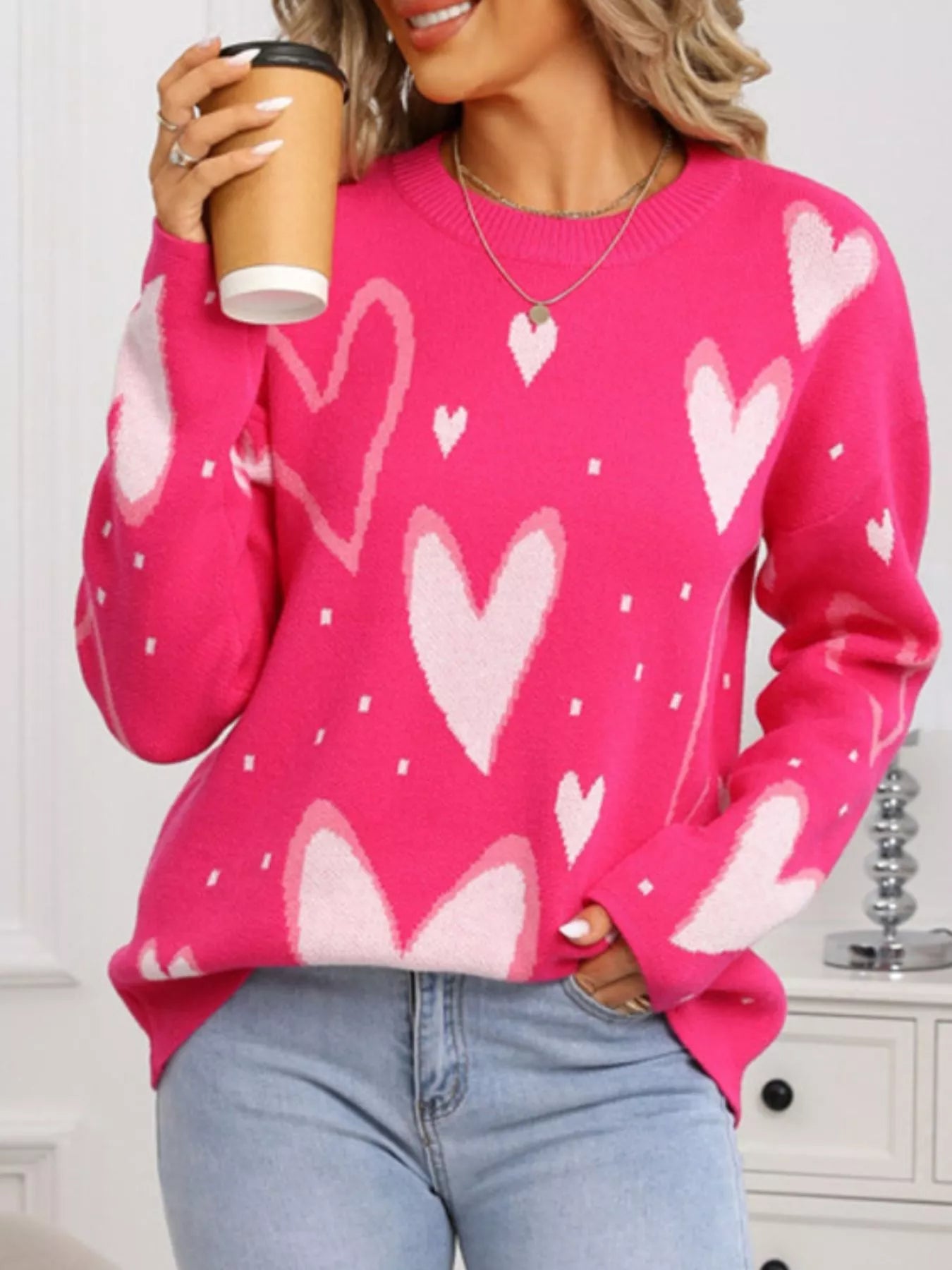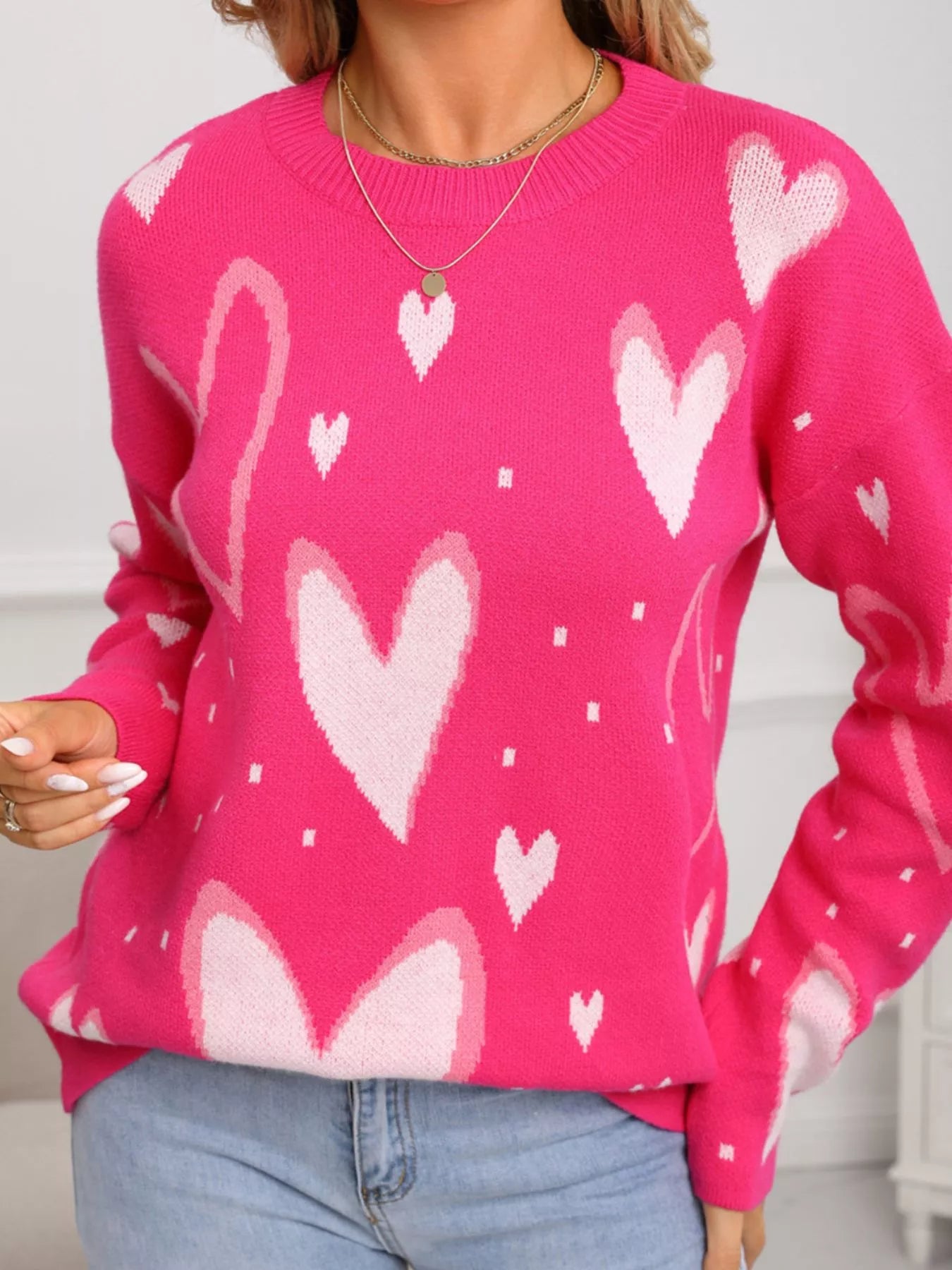 Valentine's Day Heart Round Neck Dropped Shoulder Sweater