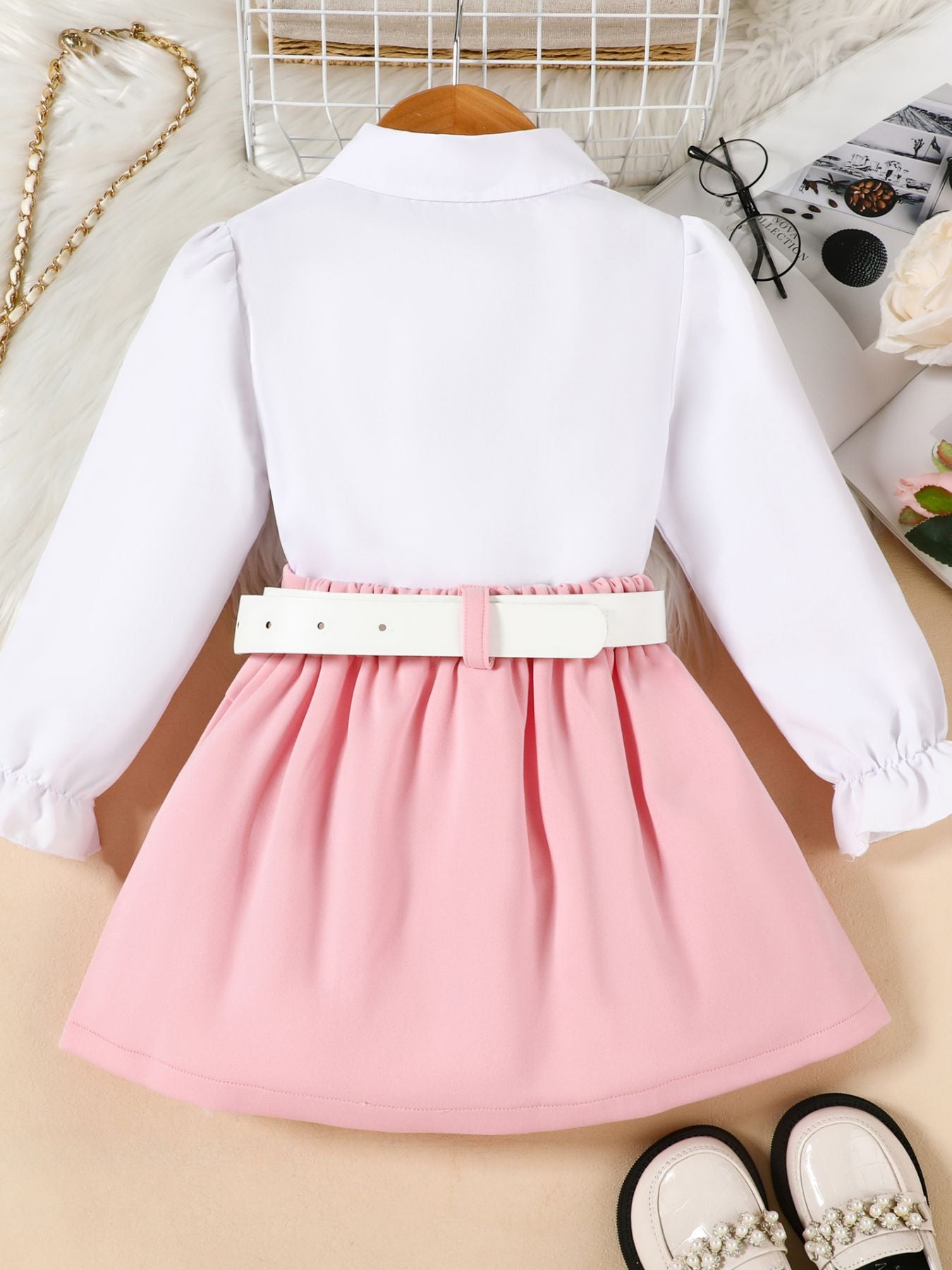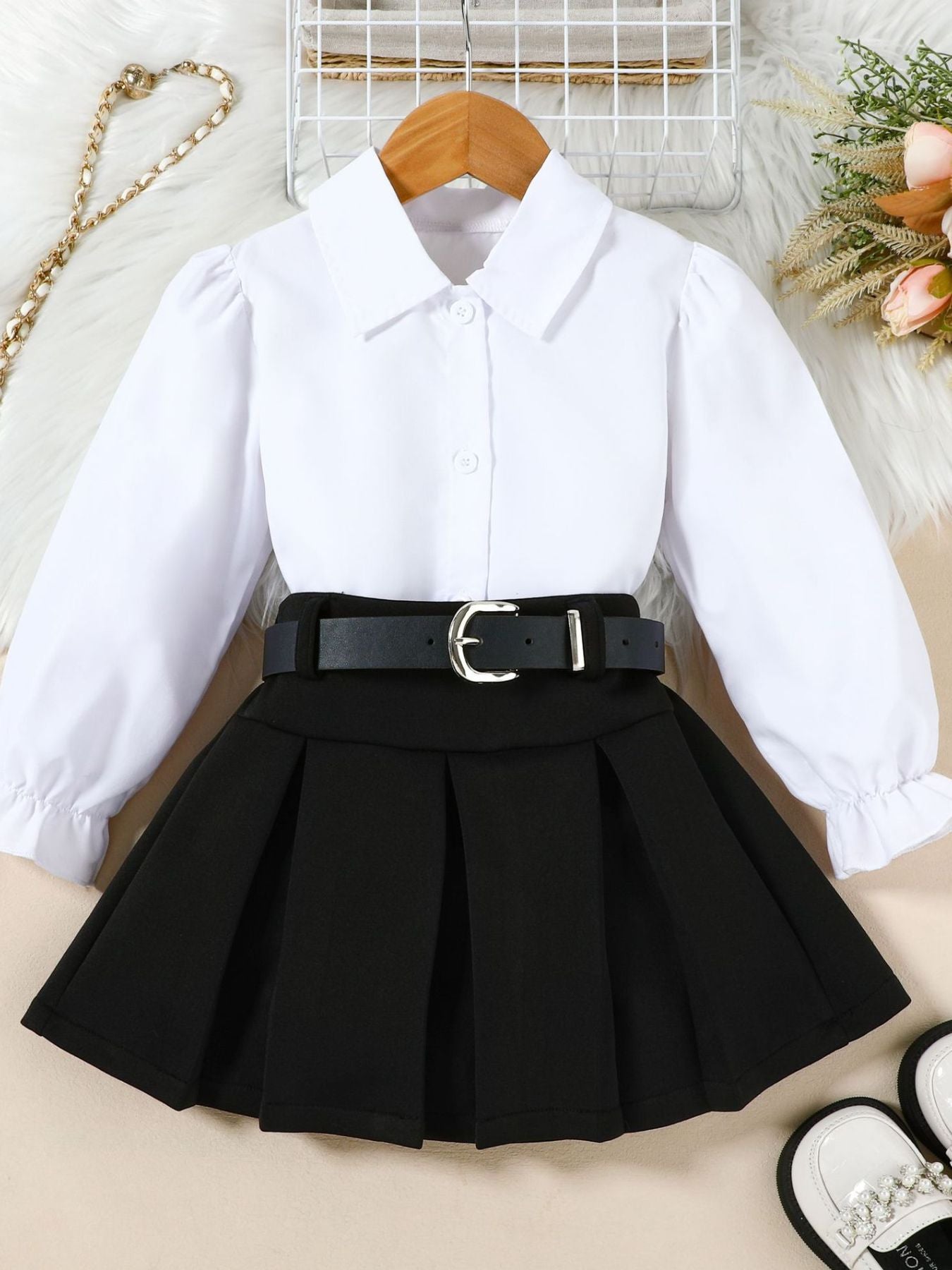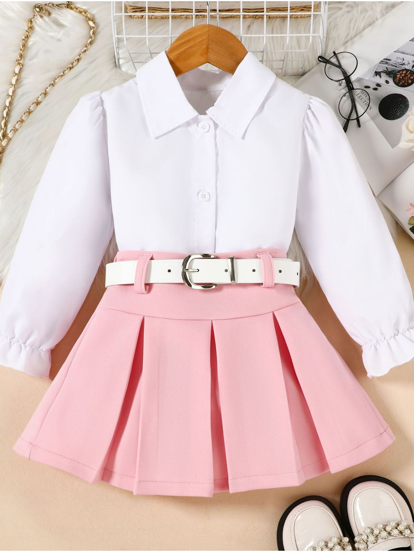 Children's Long Sleeve Shirt & Pleated Skirt Set with Belt