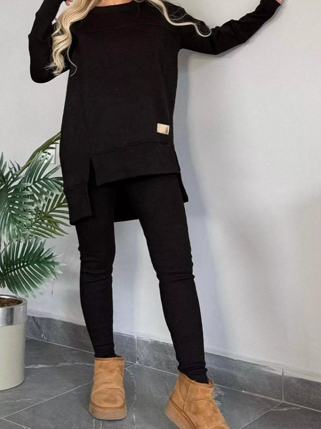 Full Size Slit Round Neck Top and Pants Set Plus Size