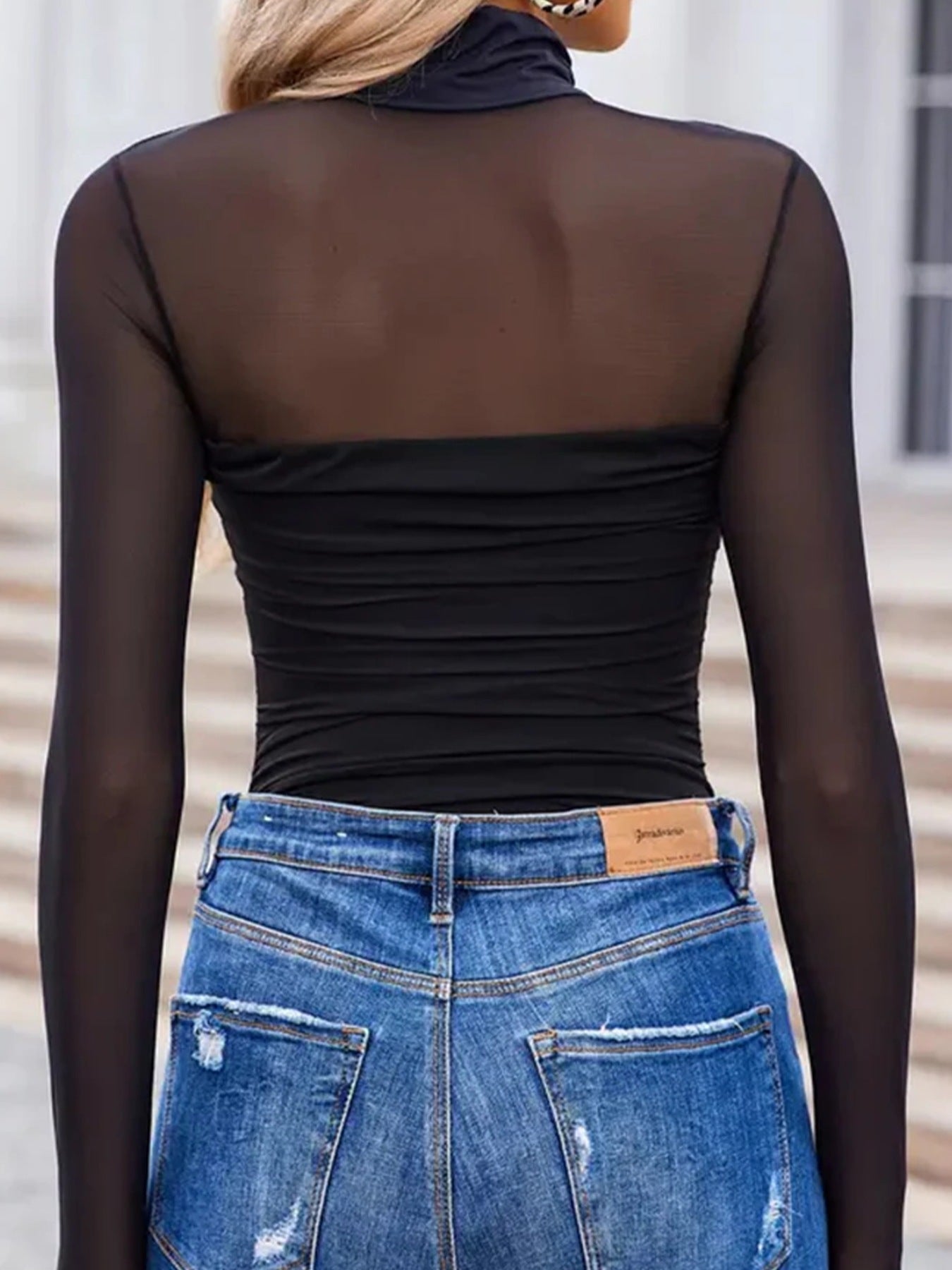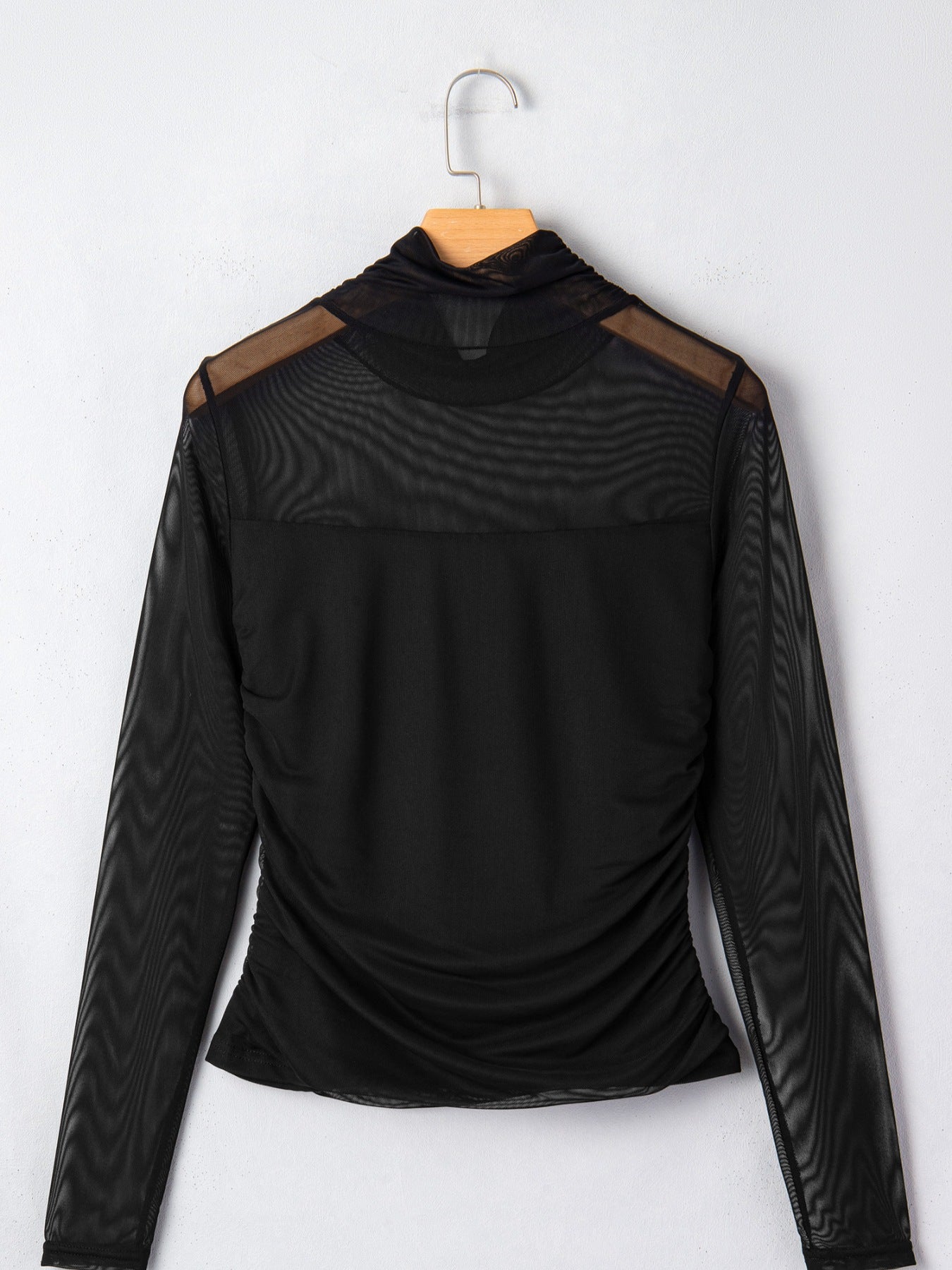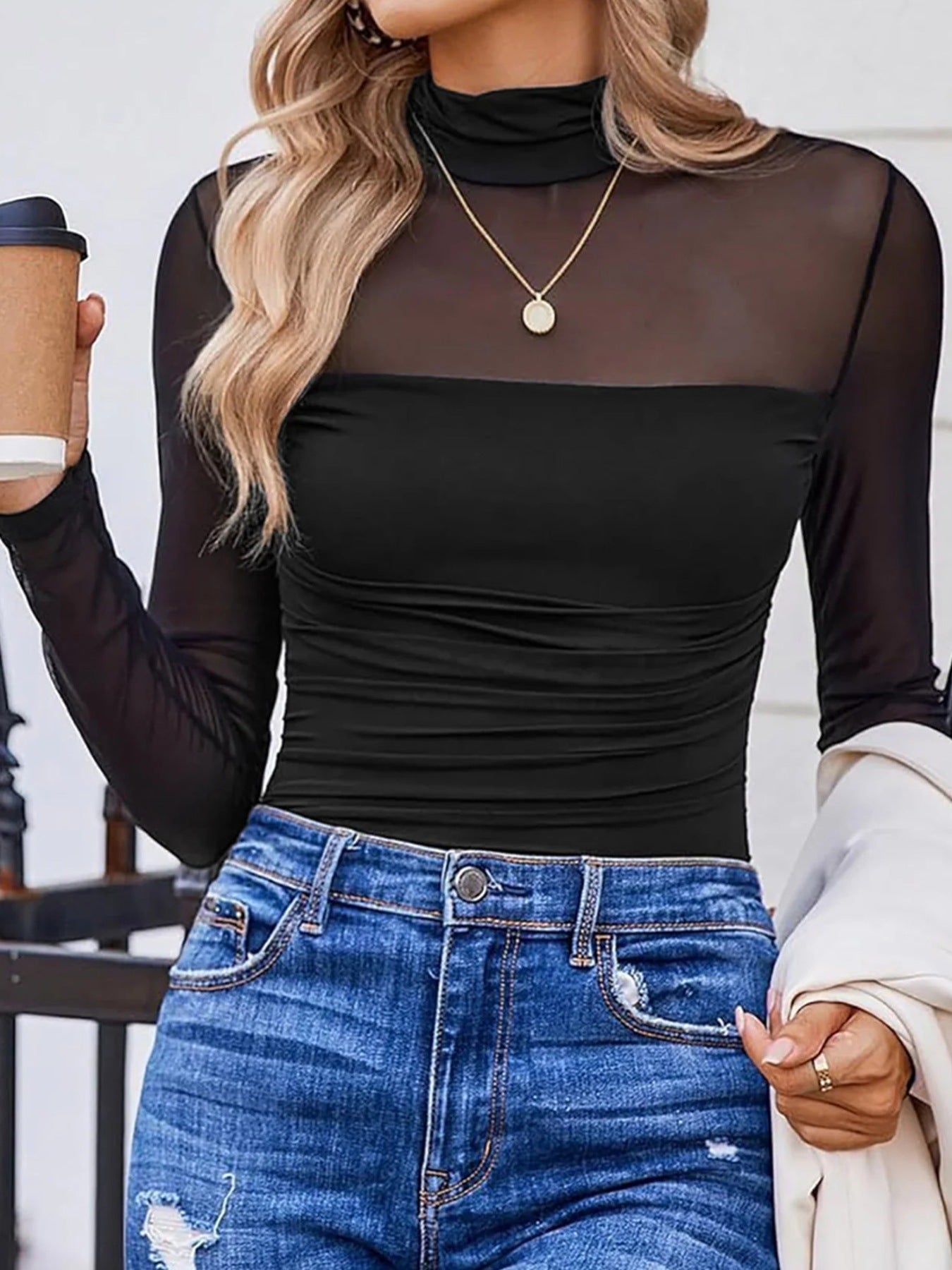Sheer Mesh Patchwork High Neck Long Sleeve Top
