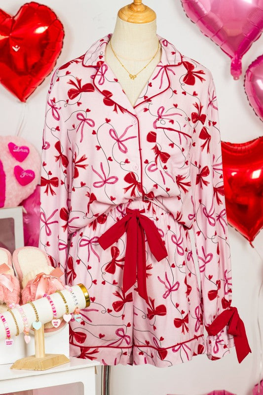Cuddle up in style with this adorable Shirt and Shorts Pajama Set! Featuring a charming romantic bow design perfect for spreading love this season, this two-piece set pairs a long-sleeve shirt with matching shorts for a perfectly coordinated look. Crafted from soft, breathable fabric, you'll stay cozy and comfortable all night long. Whether you're lounging at home or getting ready for bed, this playful set brings festive flair to your sleepwear collection. 100% Viscose