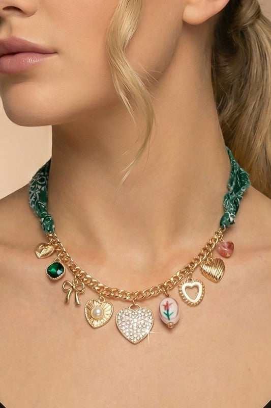 A statement charm necklace featuring a soft green bandana-style fabric paired with a polished gold-tone chain and an eclectic mix of heart and symbol charms. The design blends casual fabric texture with glossy metallic details for a playful yet elevated look. An adjustable extender allows for flexible styling and comfortable wear.