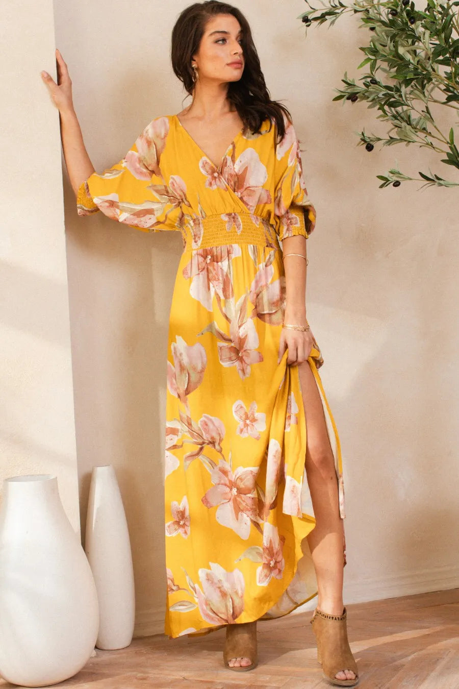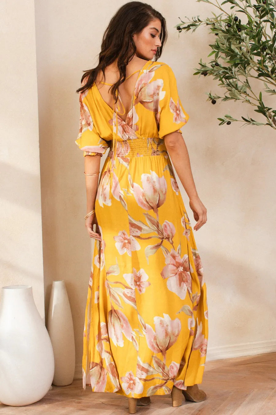 A floral print open tie back maxi dress is a stylish and feminine choice for various occasions. This dress typically features a long length, flowing silhouette, and a floral print design, which adds a touch of elegance and romance. The open tie back detail at the back of the dress adds a flirty and playful element to the overall look. This style is perfect for summer events, beach outings, or garden parties. You can pair it with sandals or wedges and accessorize with delicate jewelry to complete the outfit.