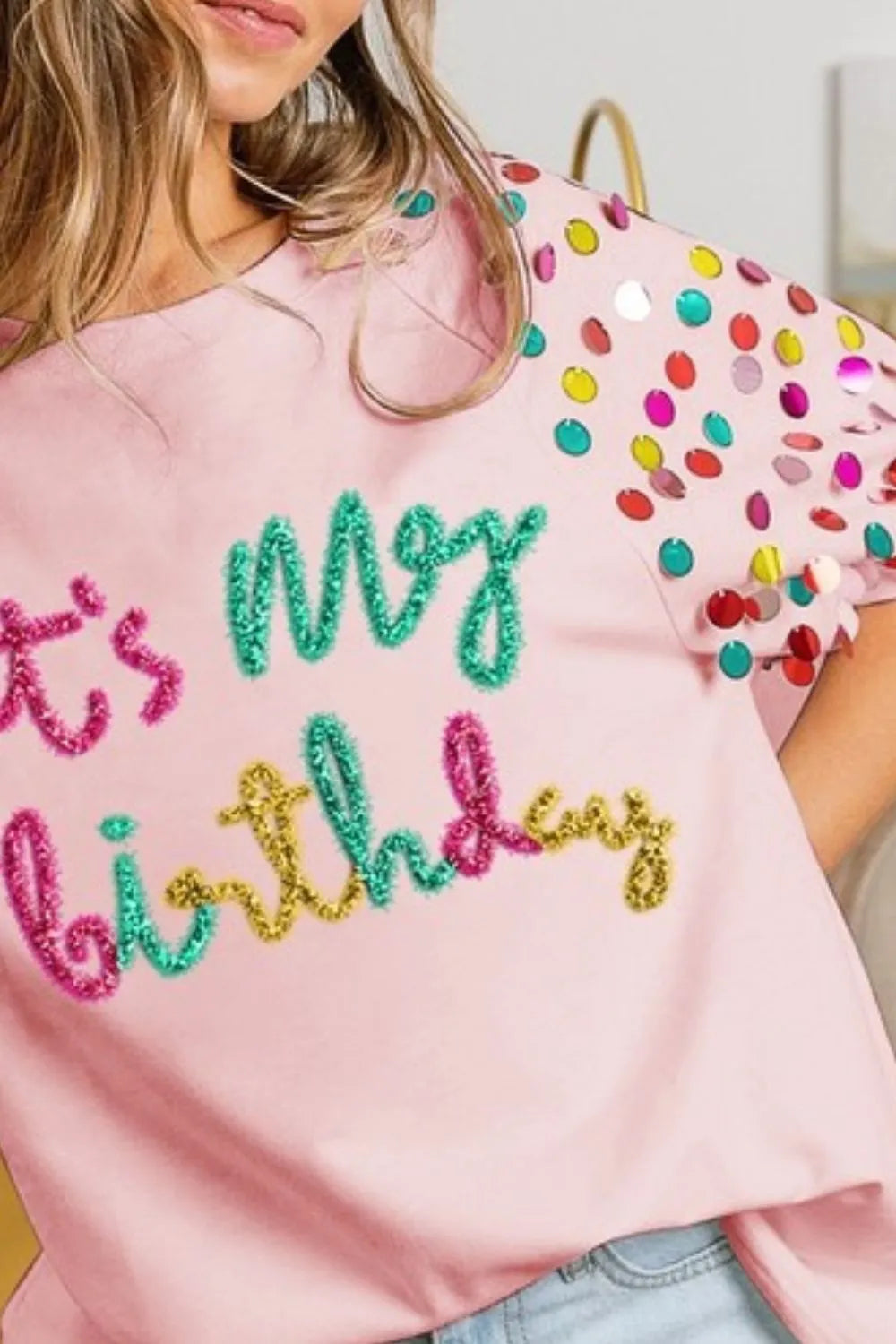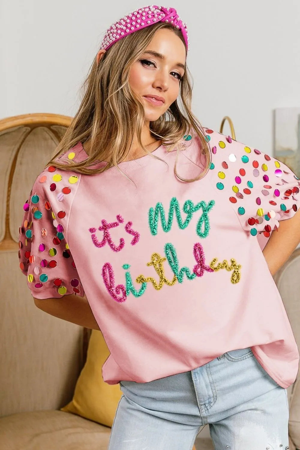 BiBi Metallic Letter Spangle Raglan Puff Sleeve Top