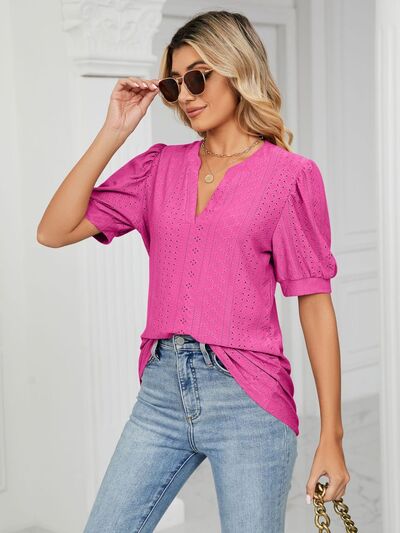 Florira Eyelet Notched Short Sleeve T-Shirt