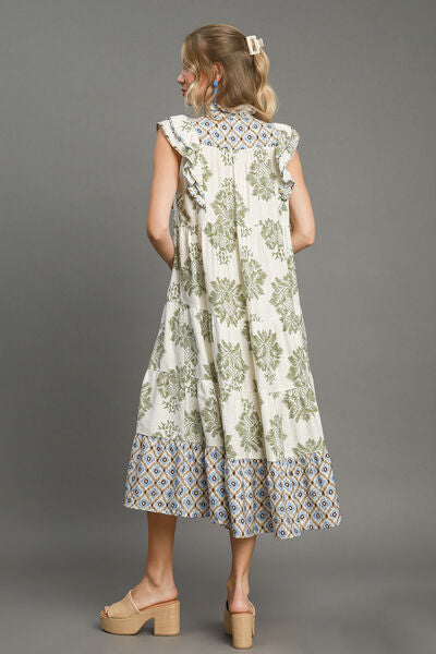 Umgee Full Size Mixed Print Ruffle Cap Sleeve Midi Dress Plus Size