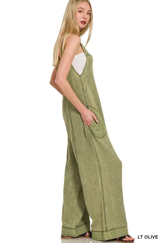 Double gauze washed wide leg overalls are a stylish and comfortable clothing option that combines a trendy silhouette with a soft and breathable fabric. The double gauze material has a lightweight and airy feel, making it perfect for warmer weather. The washed finish gives the overalls a relaxed and slightly worn-in look that adds to their charm. The wide leg design adds a fashionable touch, and the overalls can be styled in various ways for a casual and chic outfit. Pair them with a simple t-shirt or tank top underneath and accessorize with sneakers or sandals for a laid-back and effortless look. These overalls are versatile and can be worn for various occasions, from running errands to a casual day out with friends.